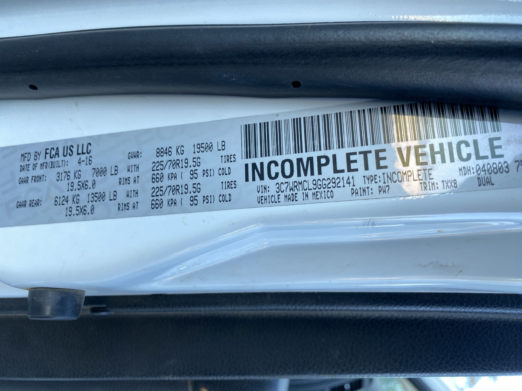 Vehicle ID Number: 3C7WRMCL9GG292141