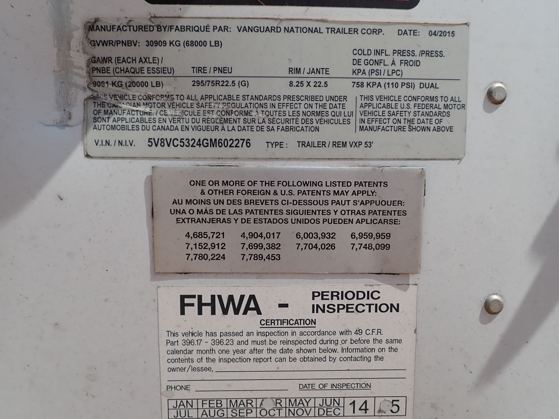2016 VANGUARD REM VXP VAN TRAILER, VIN/SN:5V8VC5324GM602276 - T/A, 53' LENGTH, BARN DOOR, 275/80R22.