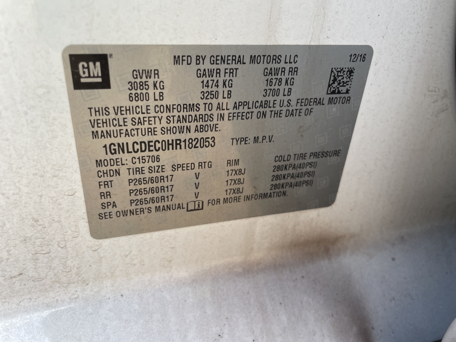Vehicle ID Number: 1GNLCDEC0HR182053