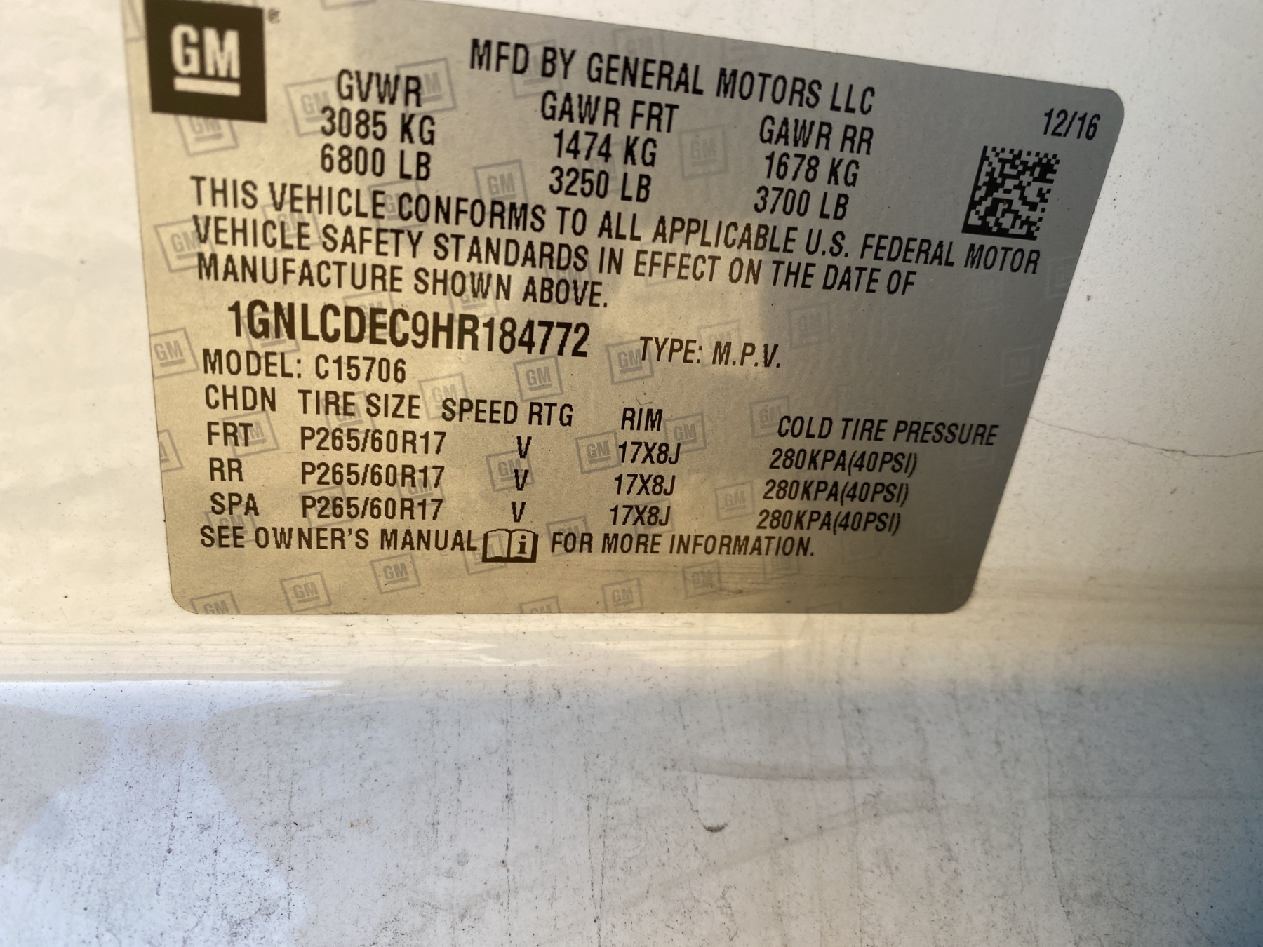 Vehicle ID Number: 1GNLCDEC9HR184772