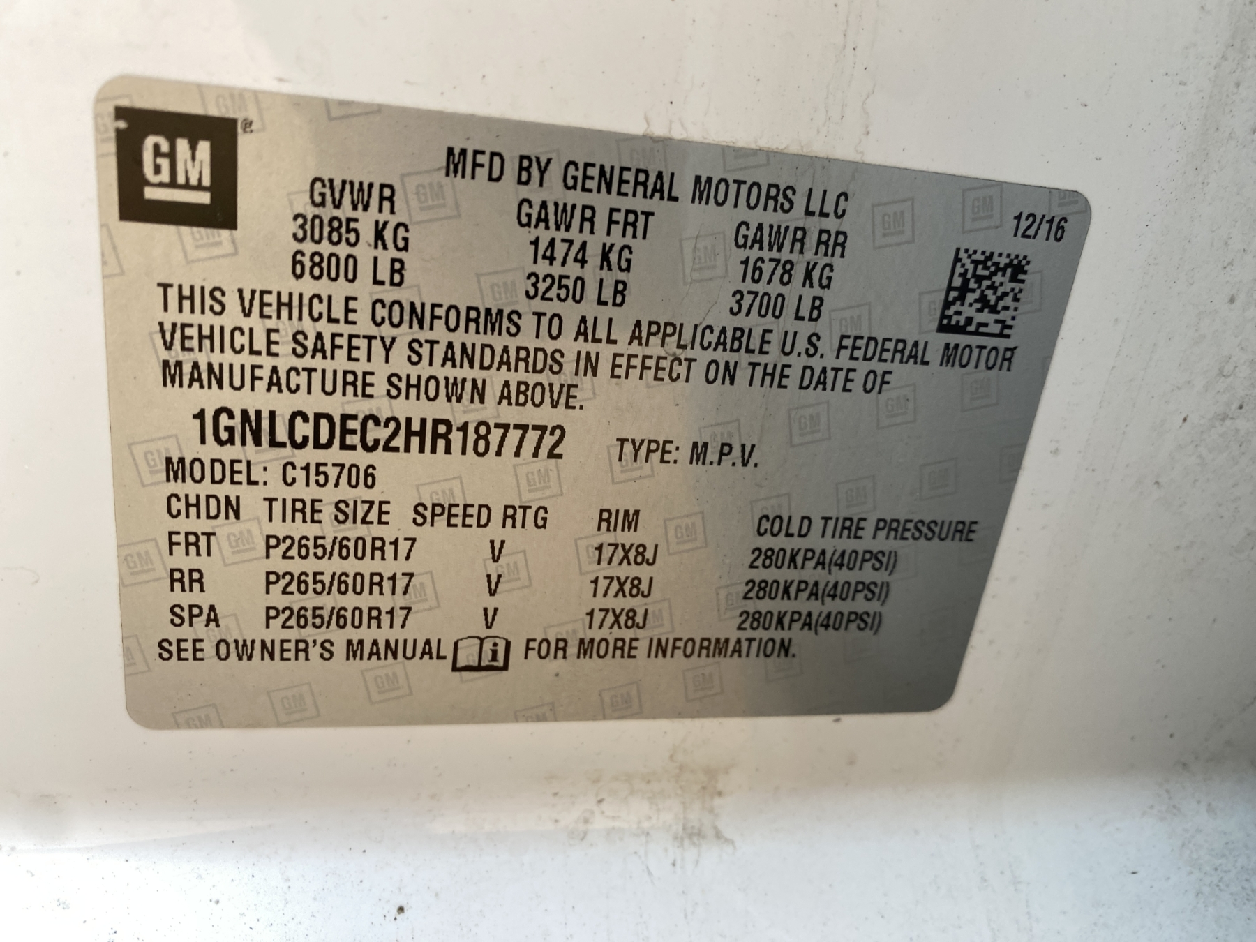 Vehicle ID Number: 1GNLCDEC2HR187772