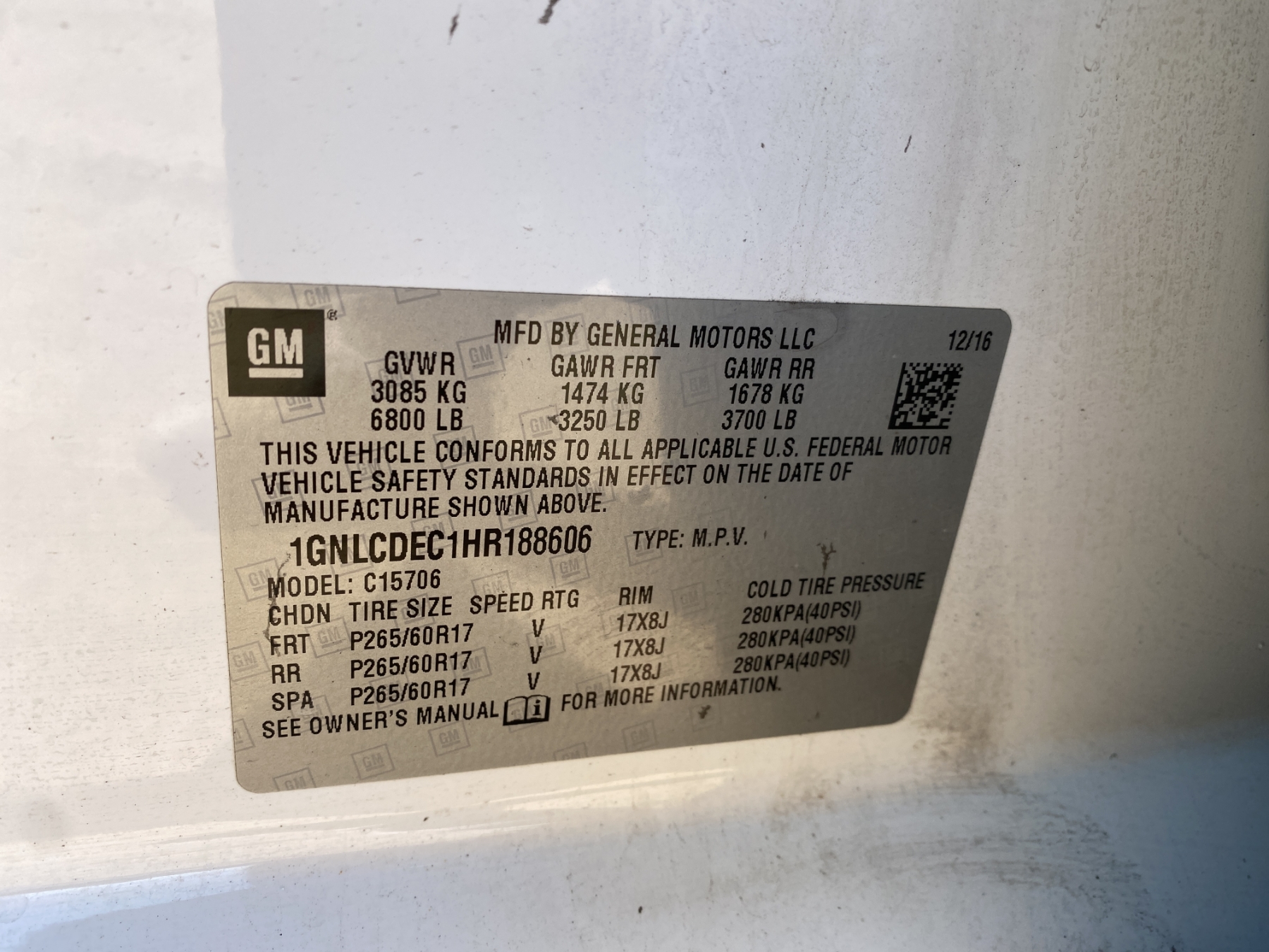 Vehicle ID Number: 1GNLCDEC1HR188606