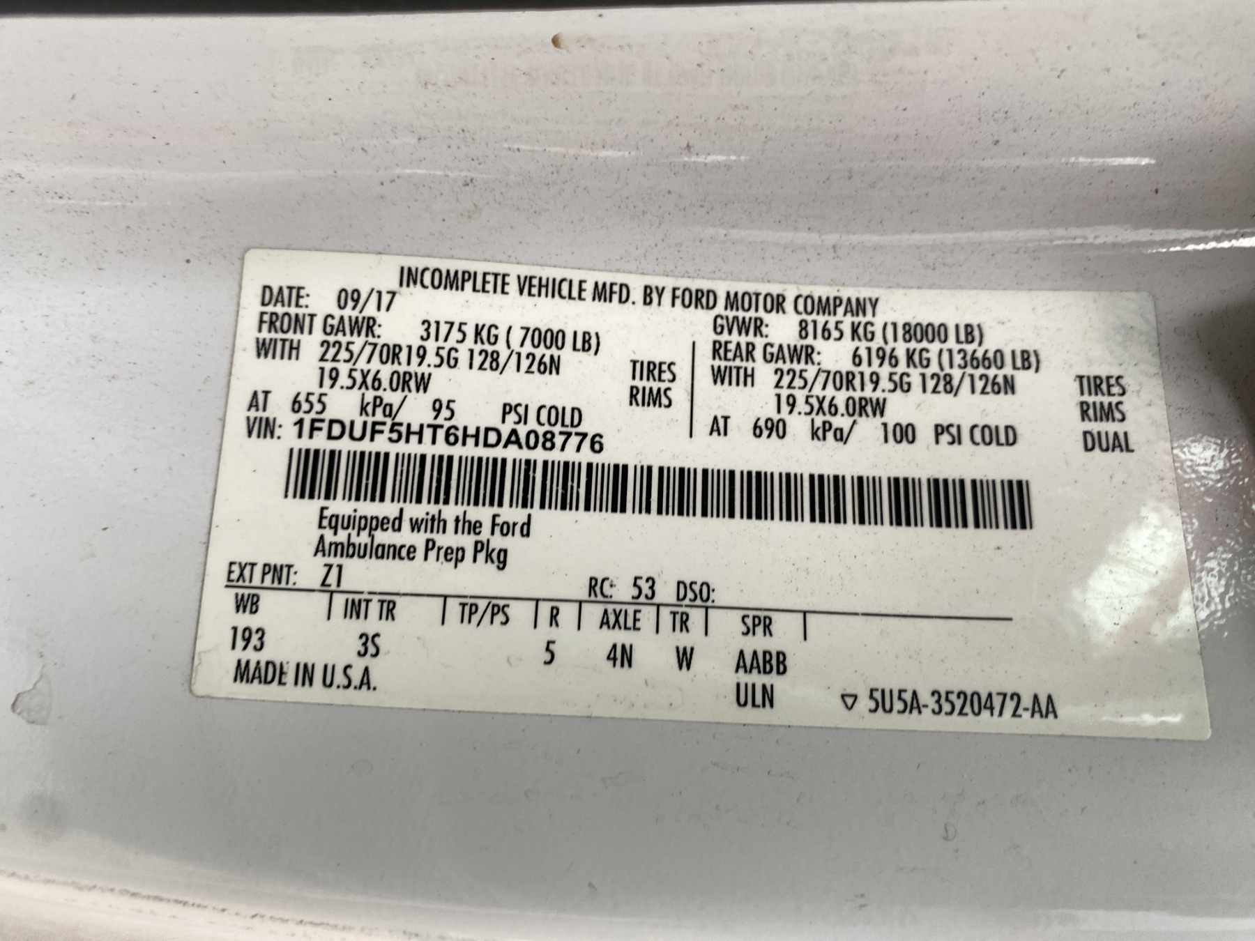 Vehicle ID Number: 1FDUF5HT6HDA08776