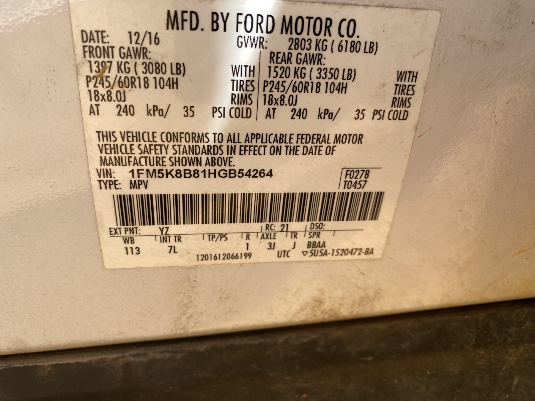 Vehicle ID Number: 1FM5K8B81HGB54264