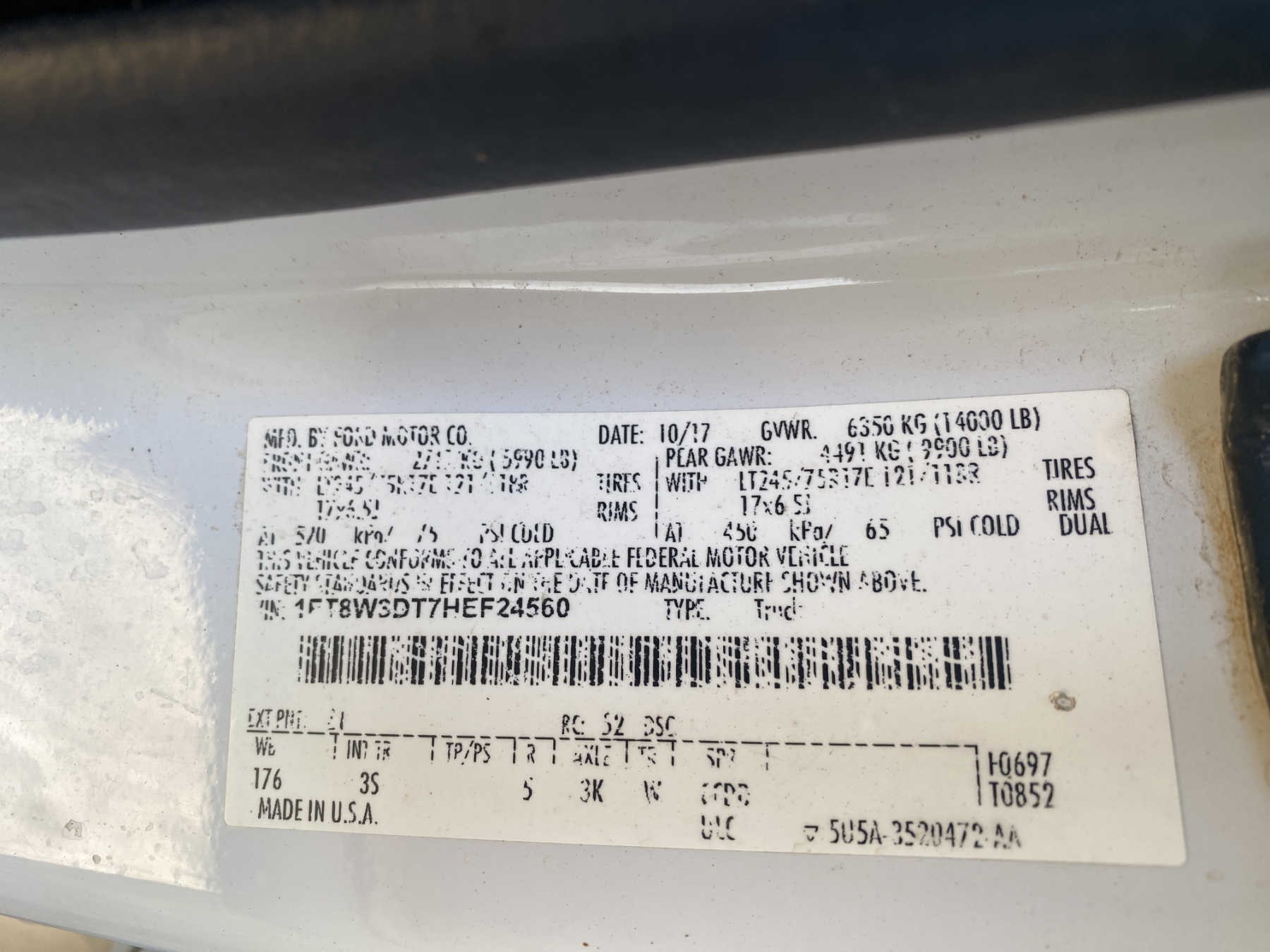 Vehicle ID Number: 1FT8W3DT7HEF24560