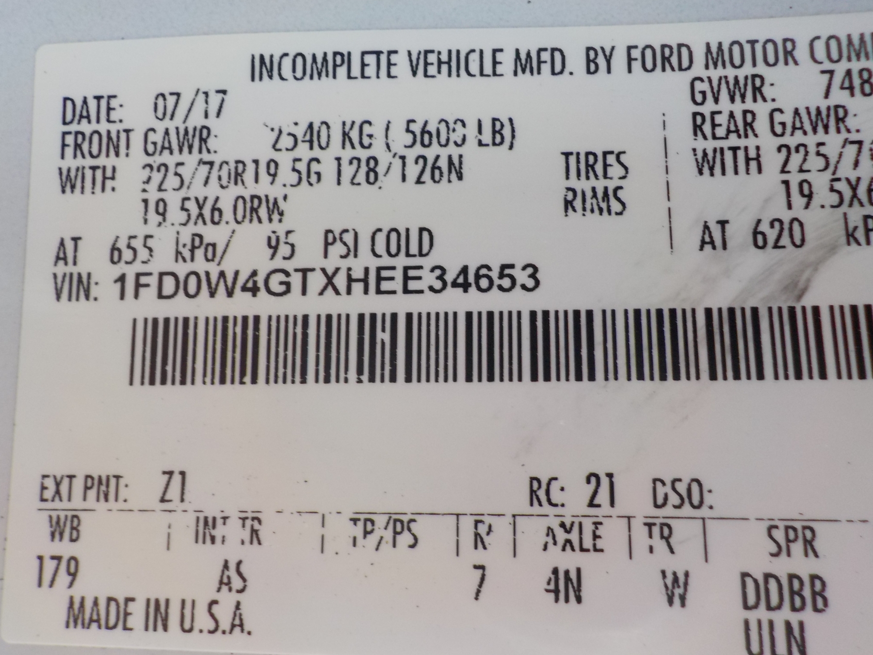 Vehicle ID Number: 1FD0W4GTXHEE34653