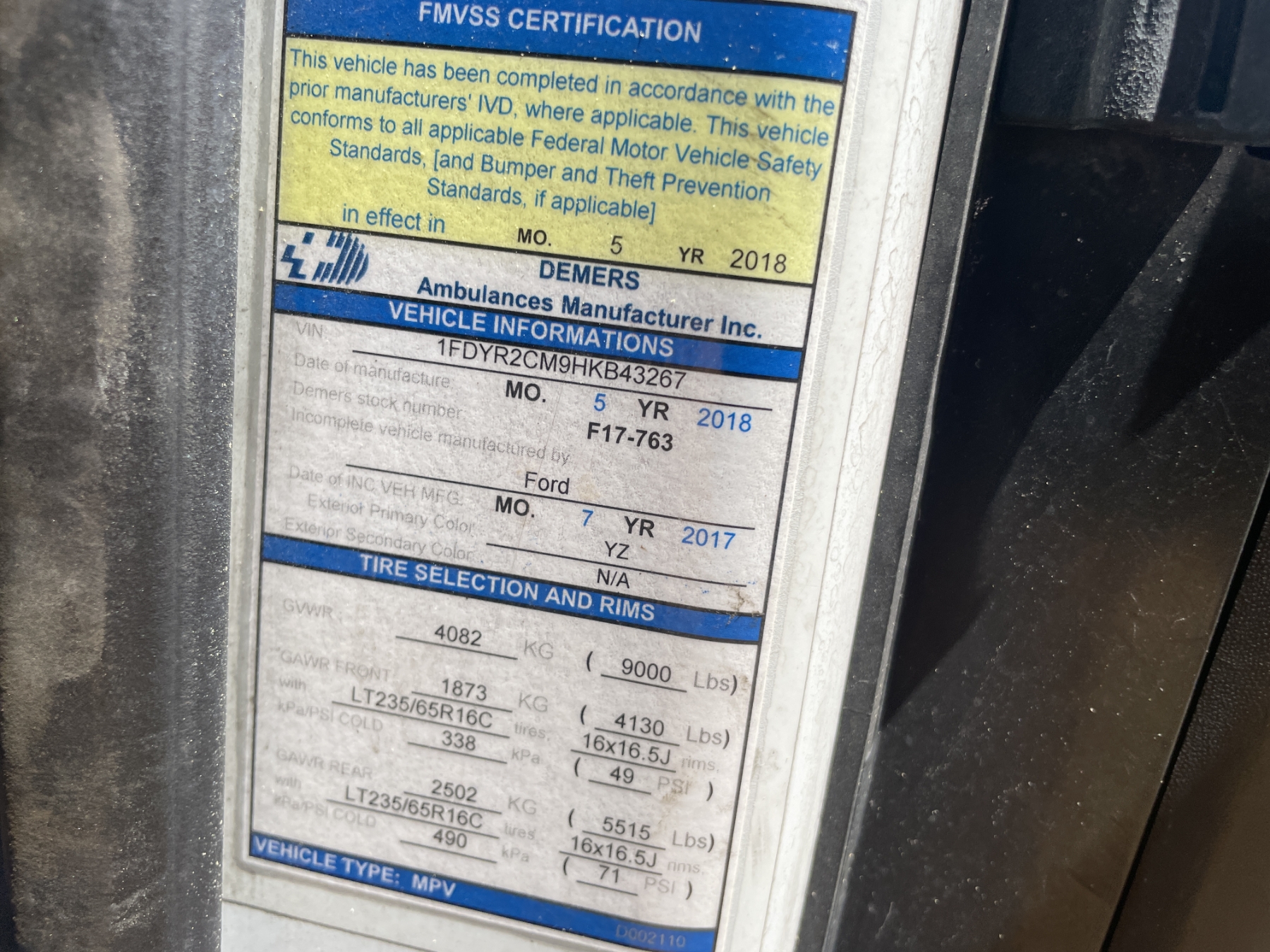 Vehicle ID Number: 1FDYR2CM9HKB43267