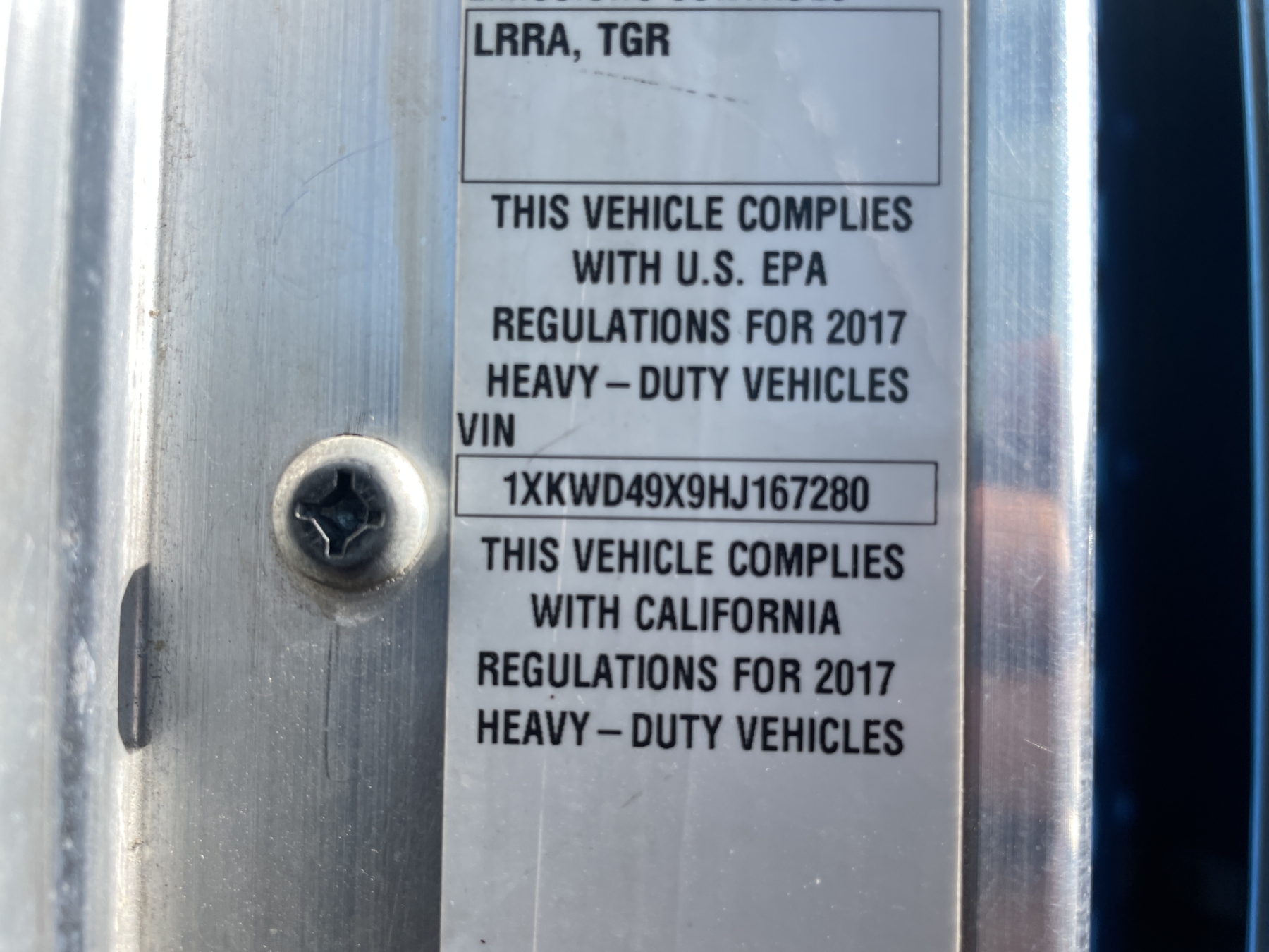 Vehicle ID Number: 1XKWD49X9HJ167280
