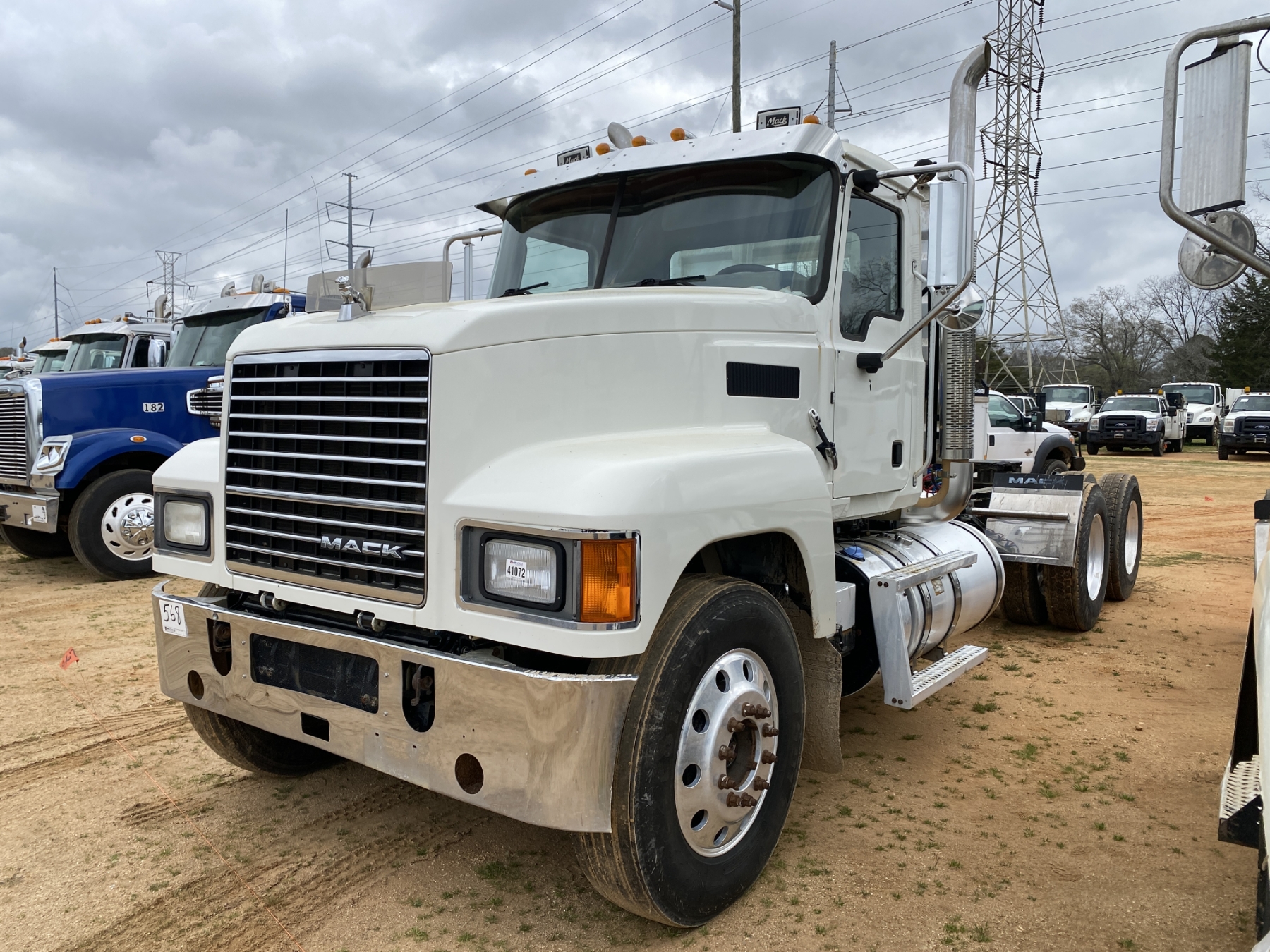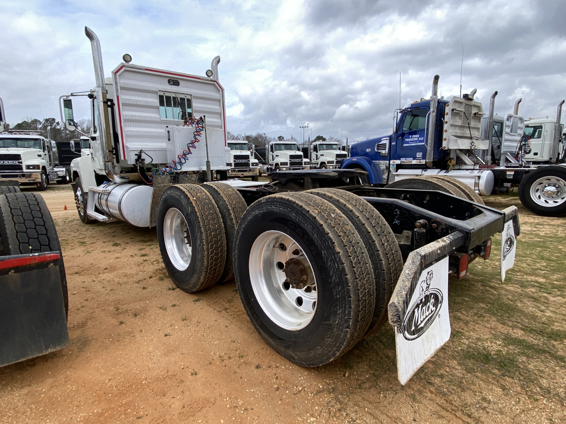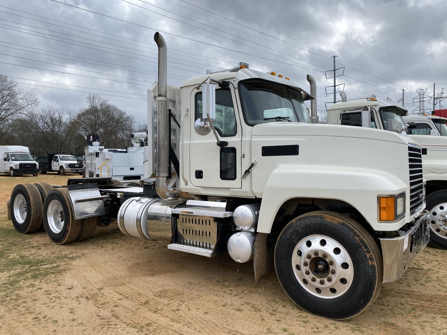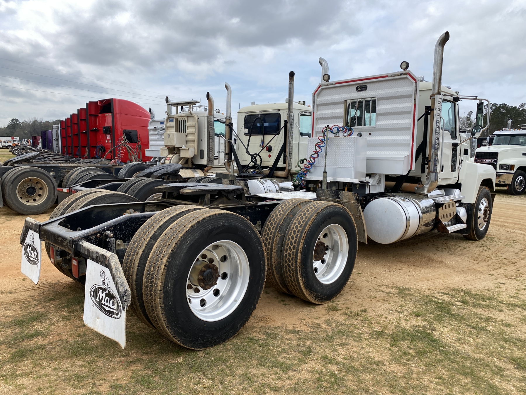 T/A, 505 HP Mack MP8 engine, 18 speed trans, 46K rears air ride, 14,320 lb. front, 235" W/B, wet kit, alum headache rack, 11R24.5 tires, all alum