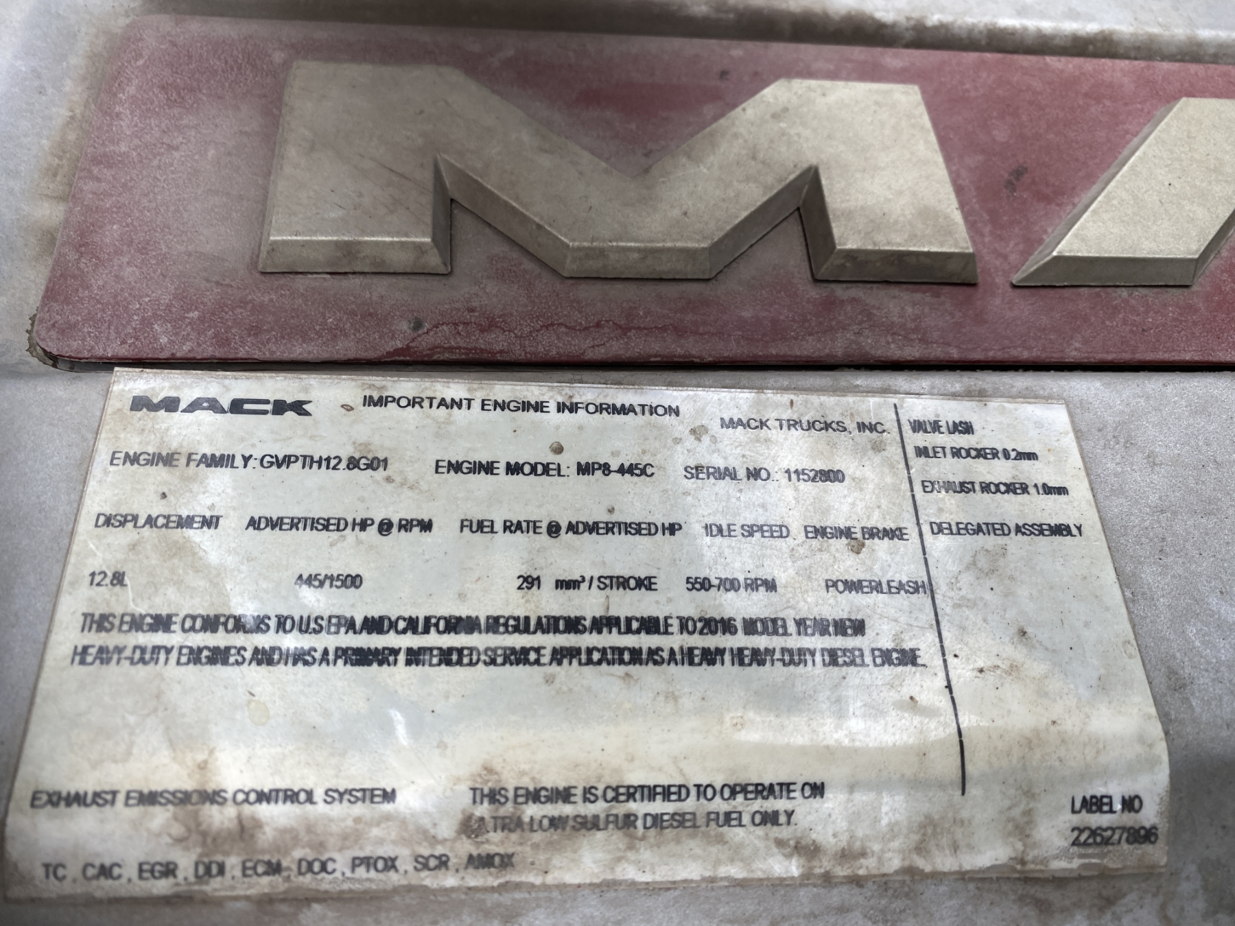 T/A, 415 HP Mack MP8 engine, Mack mDrive A/T, 40K rears, air ride, 12K front, 205" W/B, alum headache rack, 11R24.5 tires, all alum