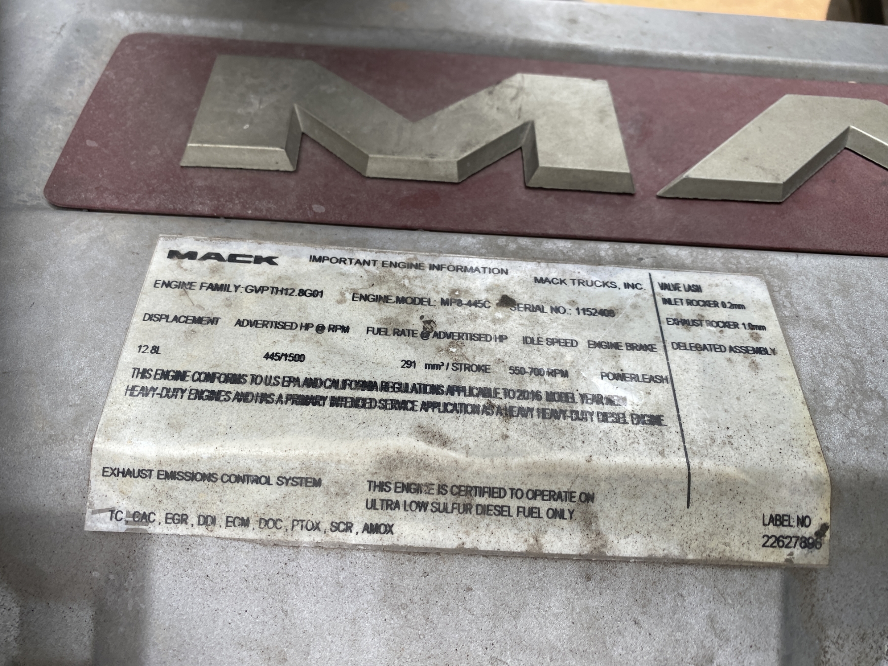 T/A, 415 HP Mack MP8 engine, Mack mDrive A/T, 40K rears, air ride, 12K front, 205" W/B, alum headache rack, 11R24.5 tires, all alum