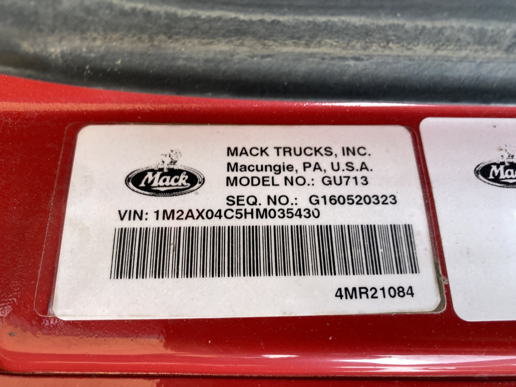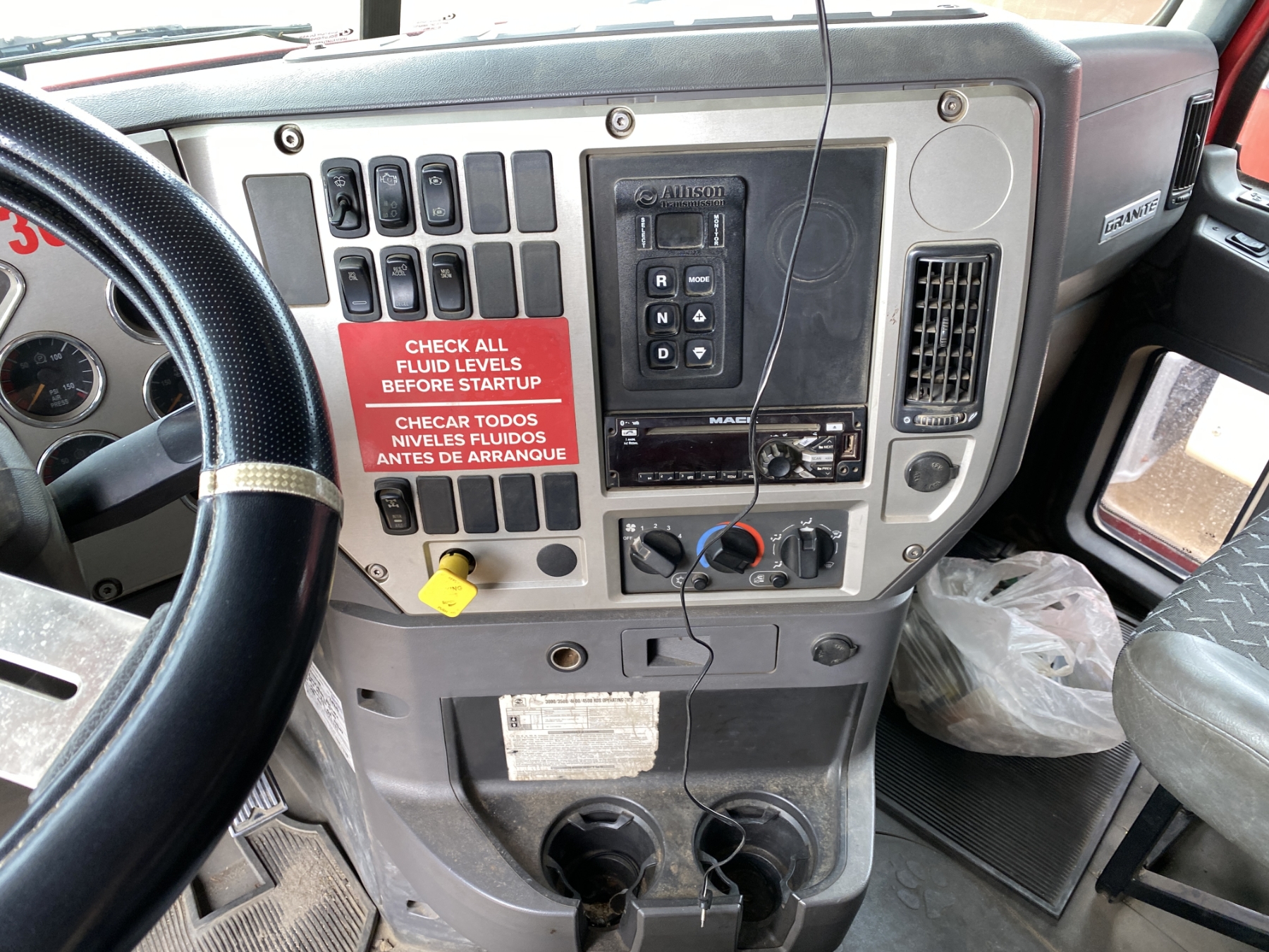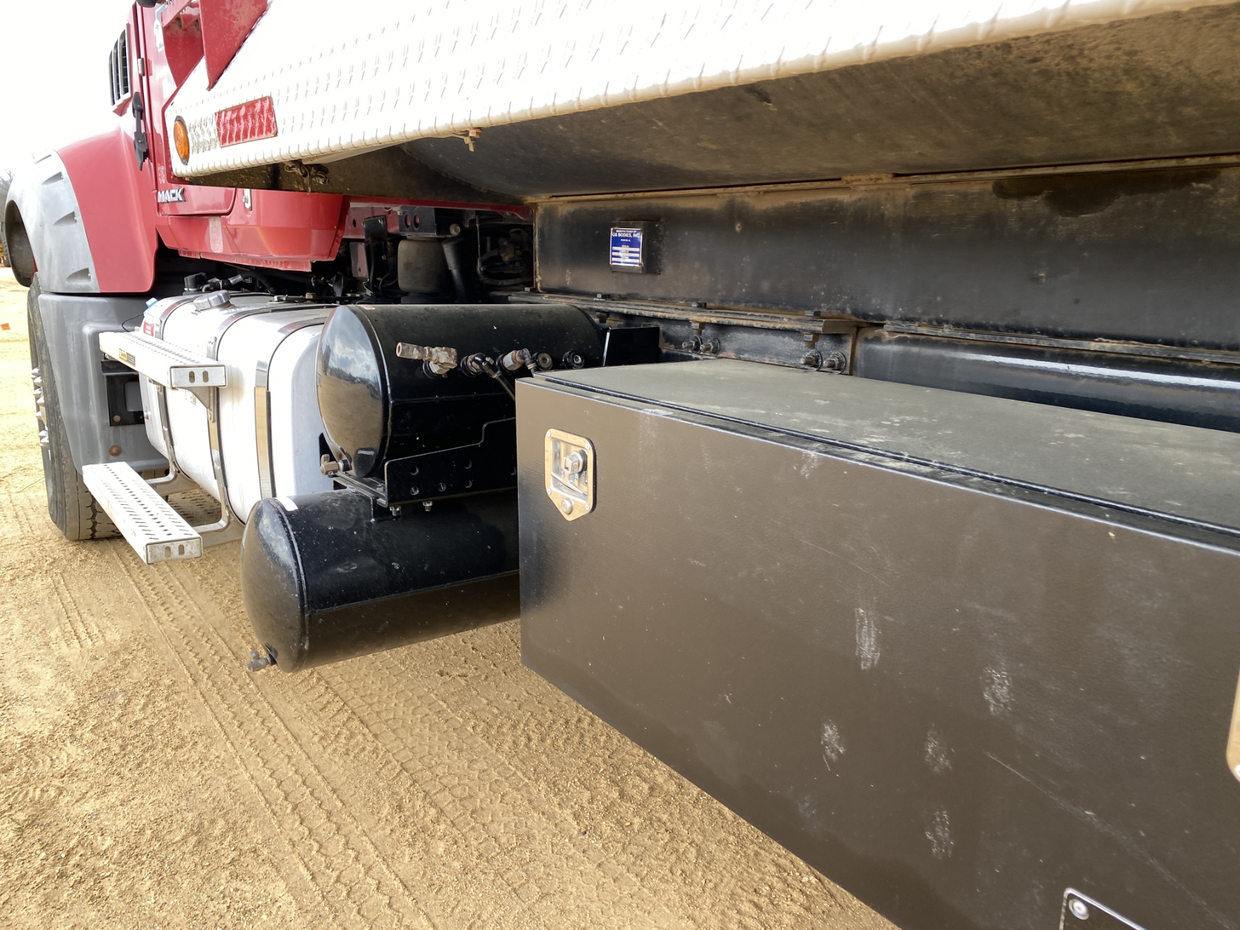 T/A, Mack MP7 engine, Allison A/T, 44K rears, 18K front, 16' Hard Ox body, high-lift gate, 11R22.5 rear tires, 385/65R22.5 front tires