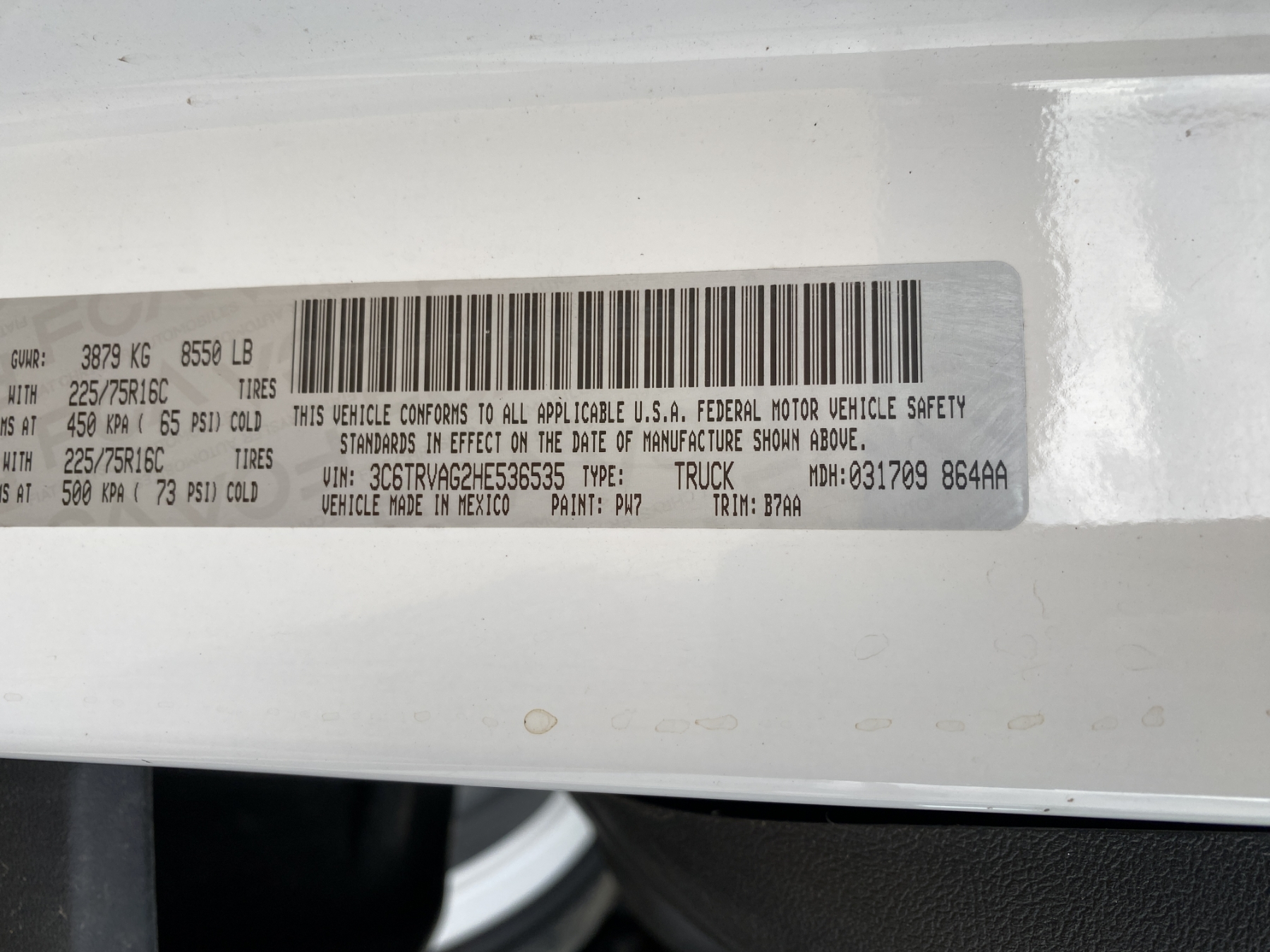 Vehicle ID Number: 3C6TRVAG2HE536535