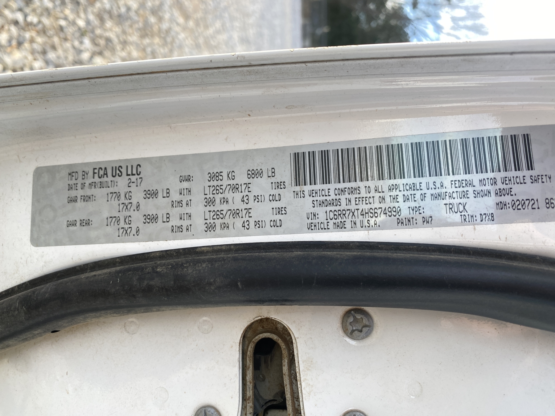 Vehicle ID Number: 1C6RR7XT4HS674990