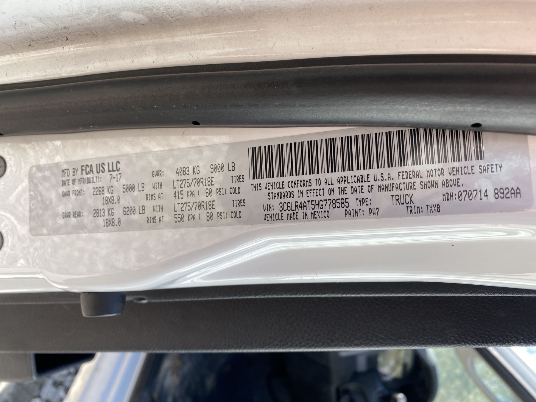 Vehicle ID Number: 3C6LR4AT5HG778585
