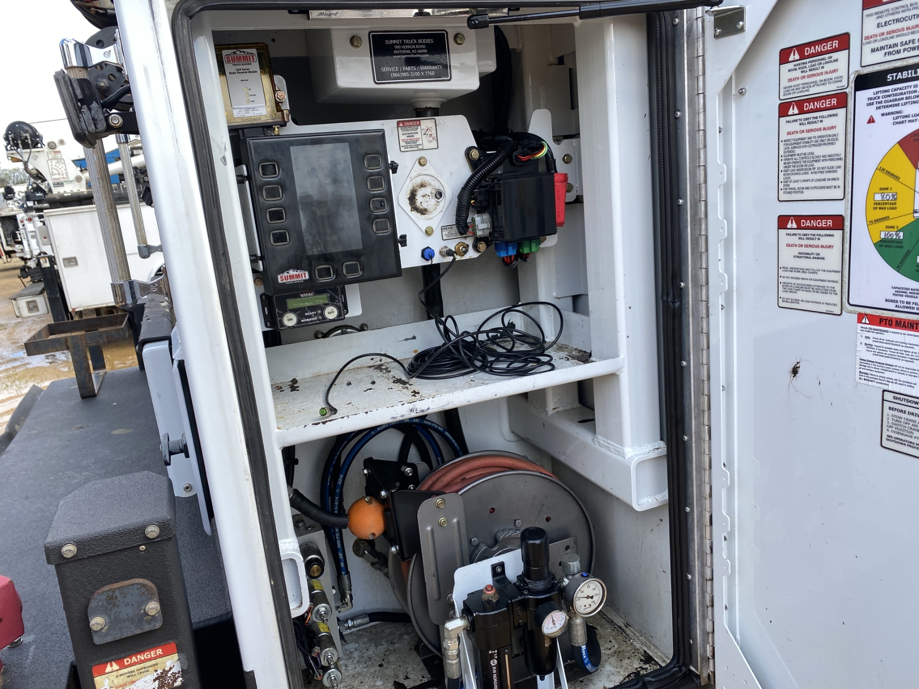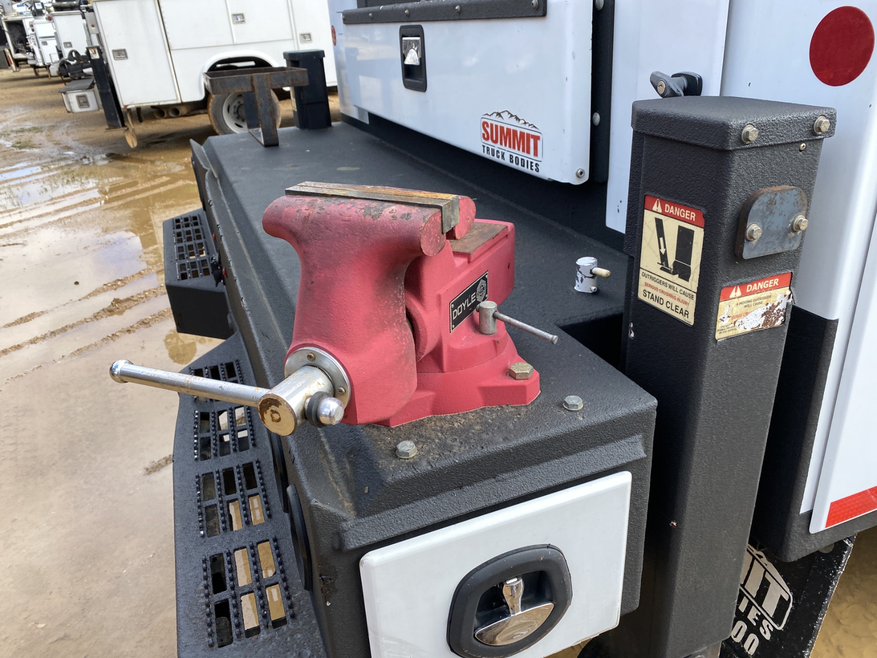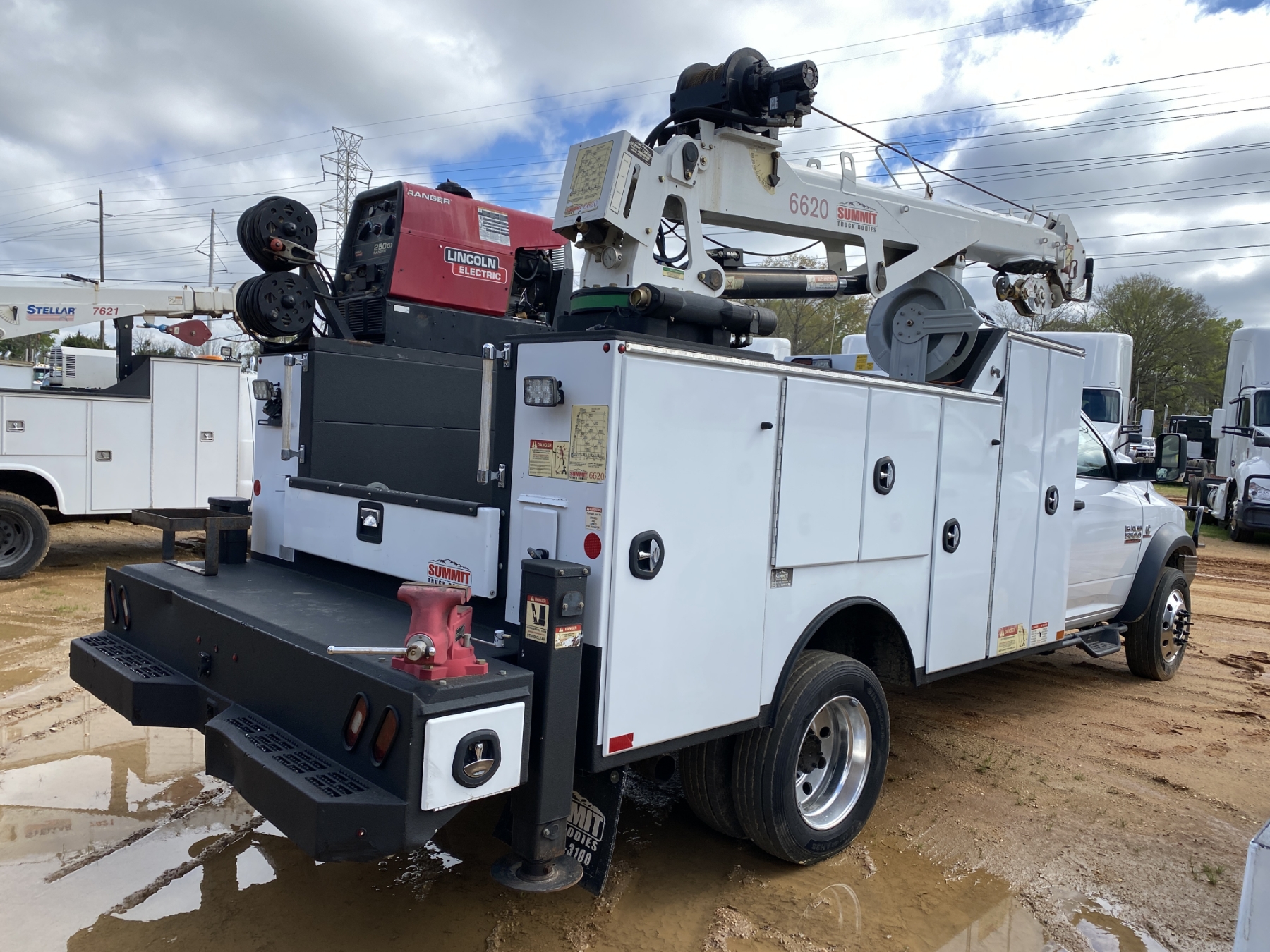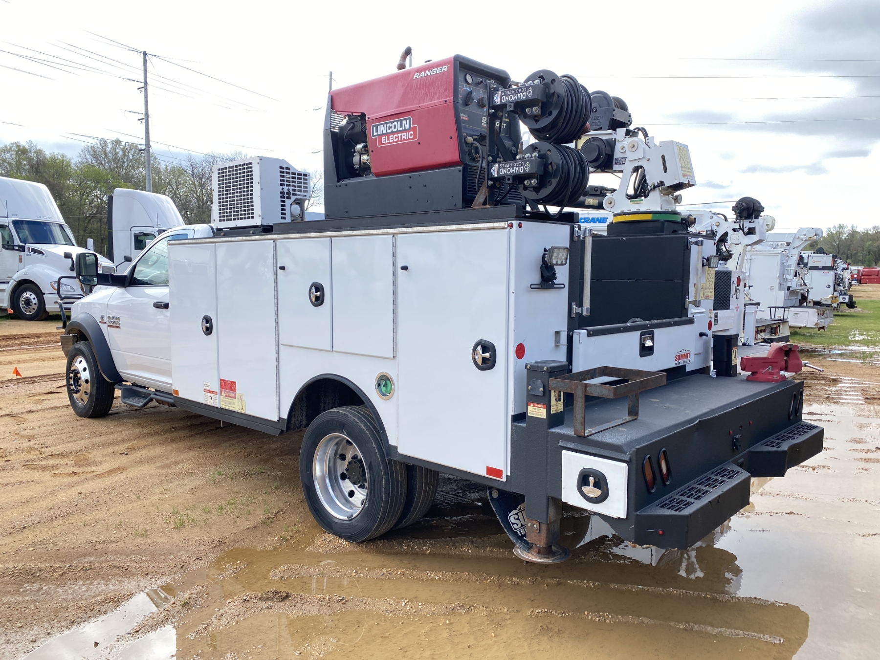 4x4, dually, Cummins engine, Allison A/T, Summit body, Summit 6620 crane, hyd air compressor, Lincoln Ranger 250 welder, workbench bumper w/ vise