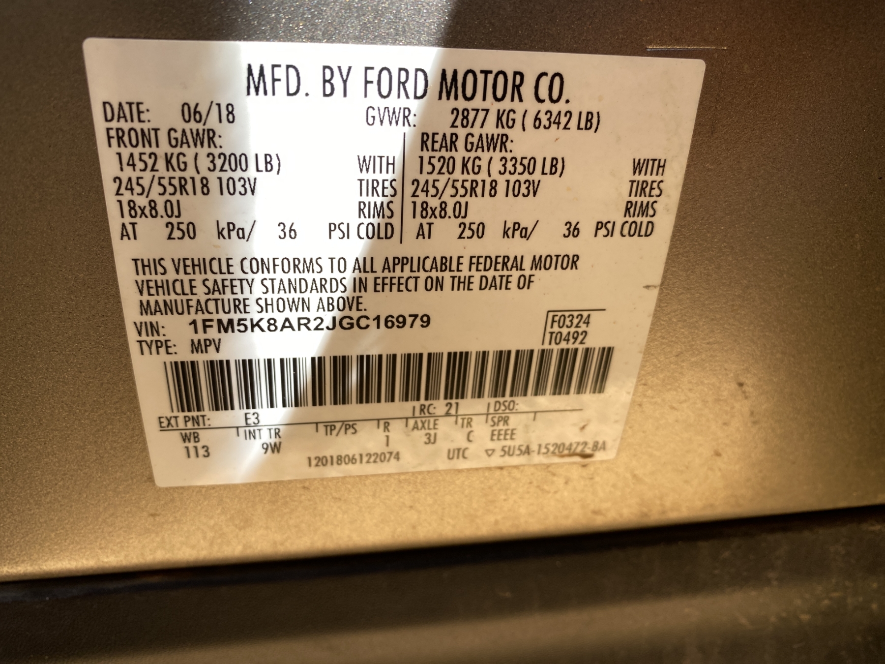 Vehicle ID Number: 1FM5K8AR2JGC16979