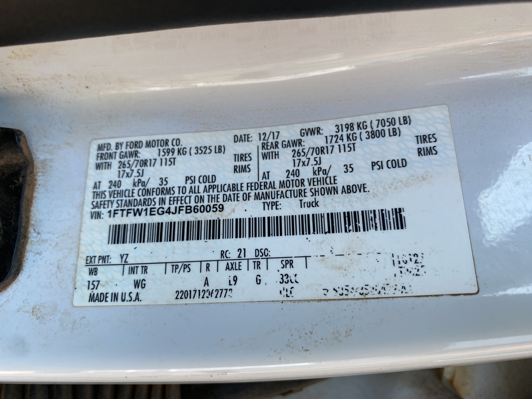 Vehicle ID Number: 1FTFW1EG4JFB60059