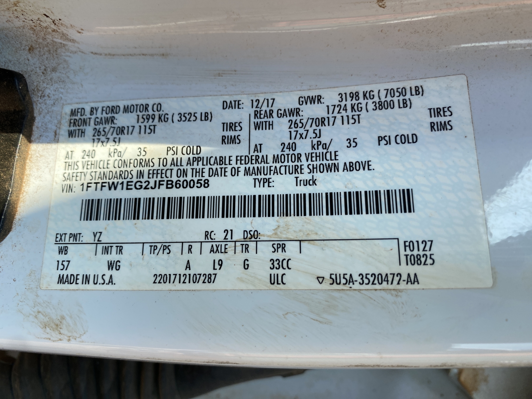 Vehicle ID Number: 1FTFW1EG2JFB60058