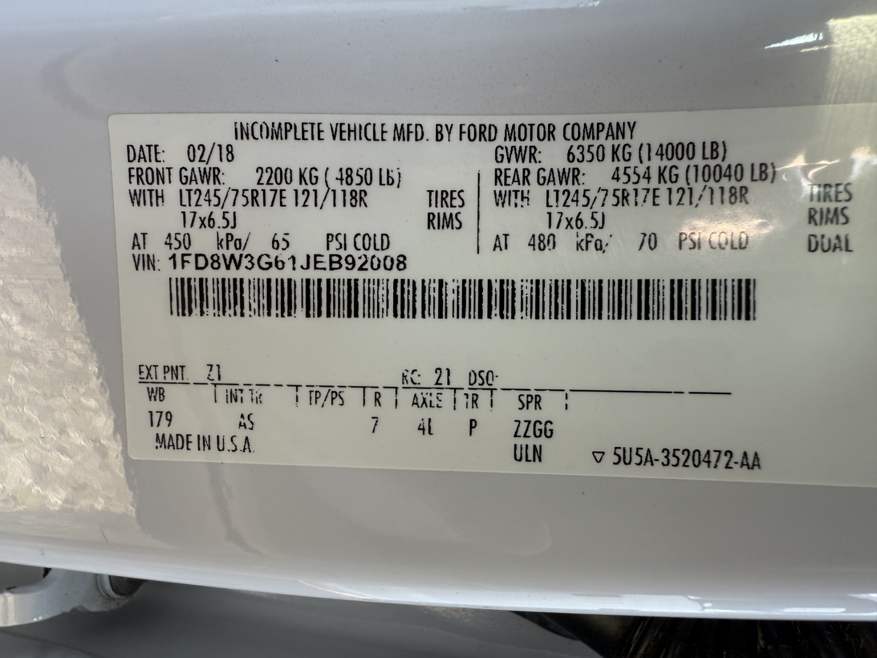 Vehicle ID Number: 1FD8W3G61JEB92008