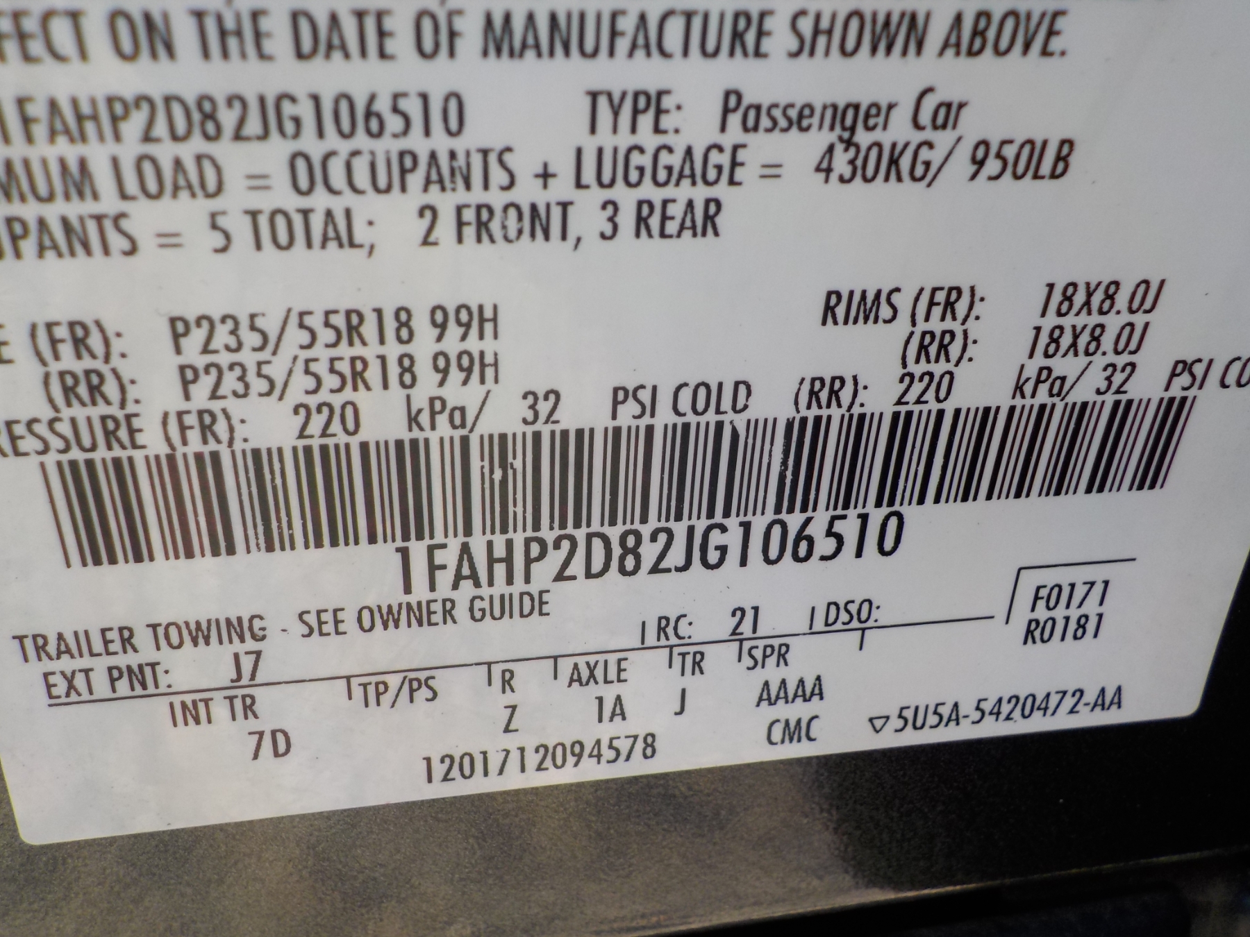 Vehicle ID Number: 1FAHP2D82JG106510