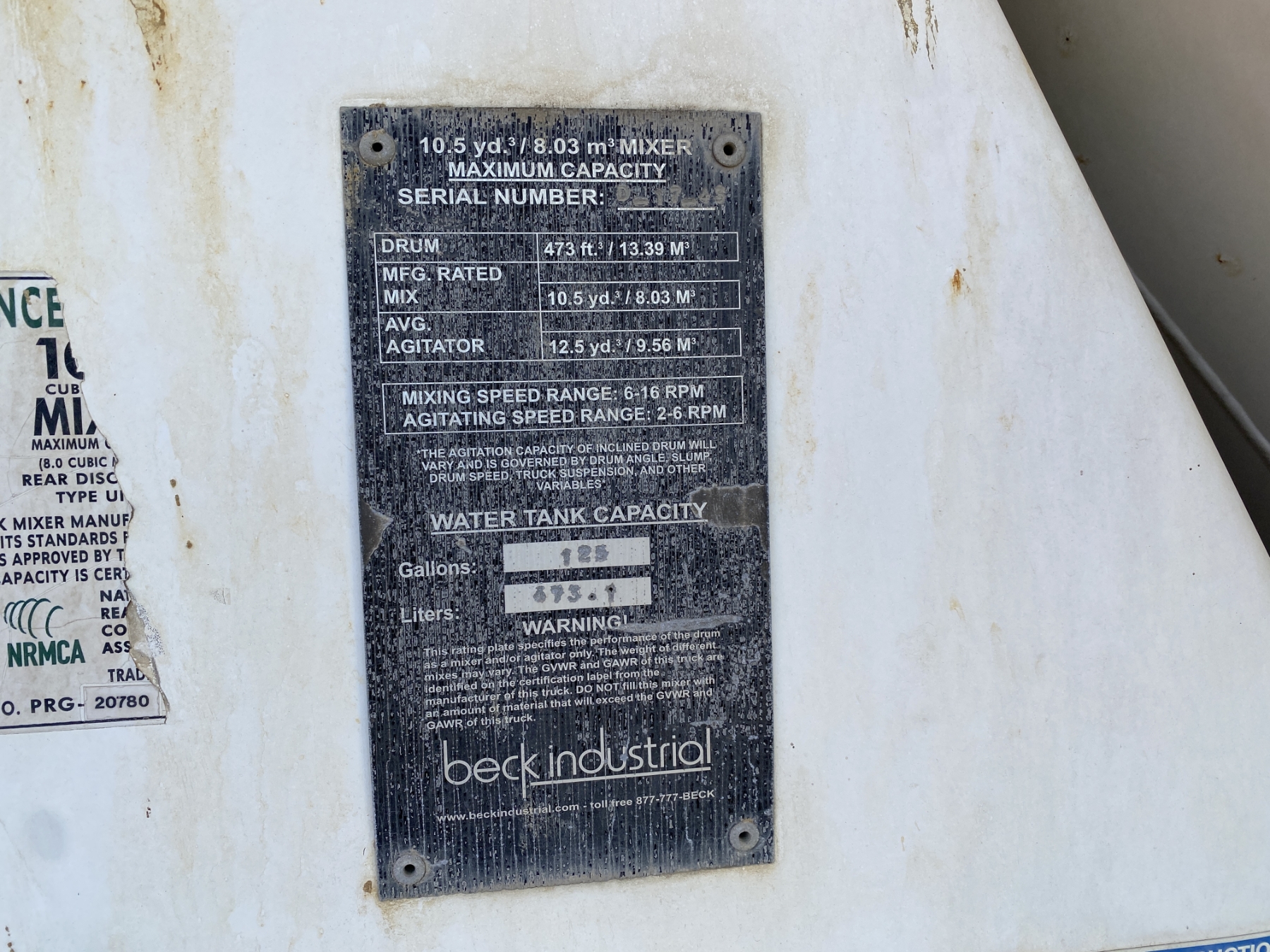 T/A, 405 HP Paccar MX-13 engine, Eaton 8LL UltraShift A/T, 46K rears, 20K front, 10.5 yd Beck mixer, 11R24.5 rear tires, 425/65R22.5 front tires