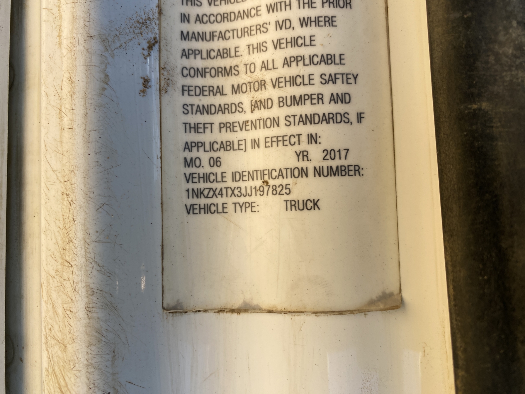 Vehicle ID Number: 1NKZX4TX3JJ197825