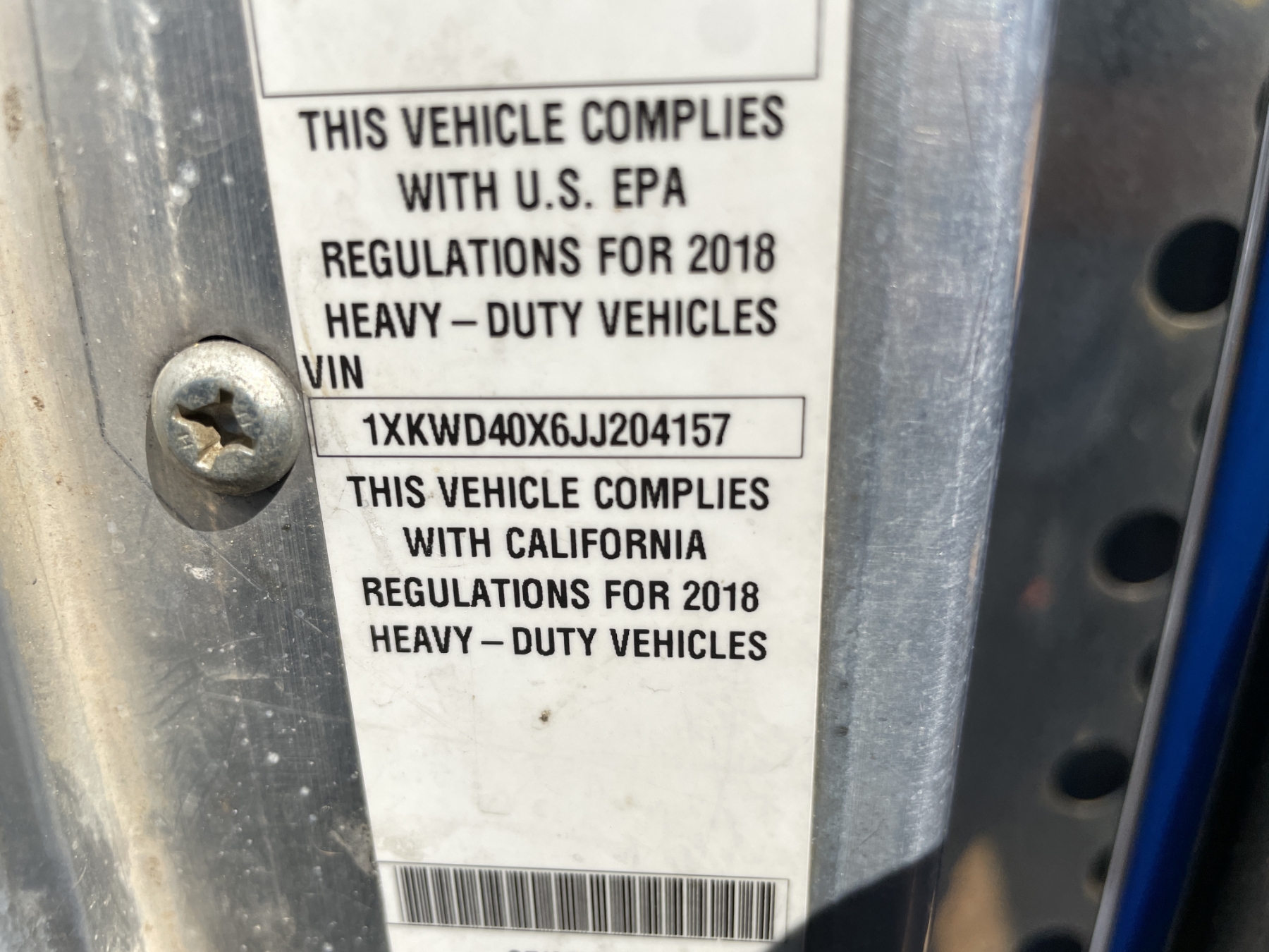 Vehicle ID Number: 1XKWD40X6JJ204157