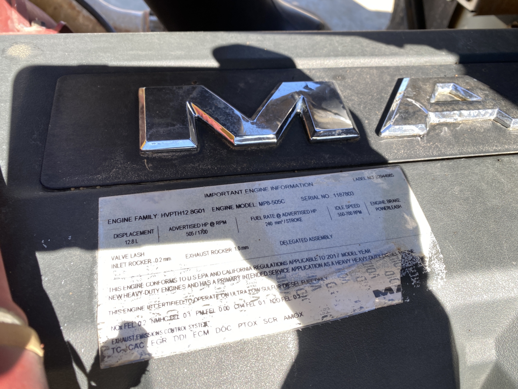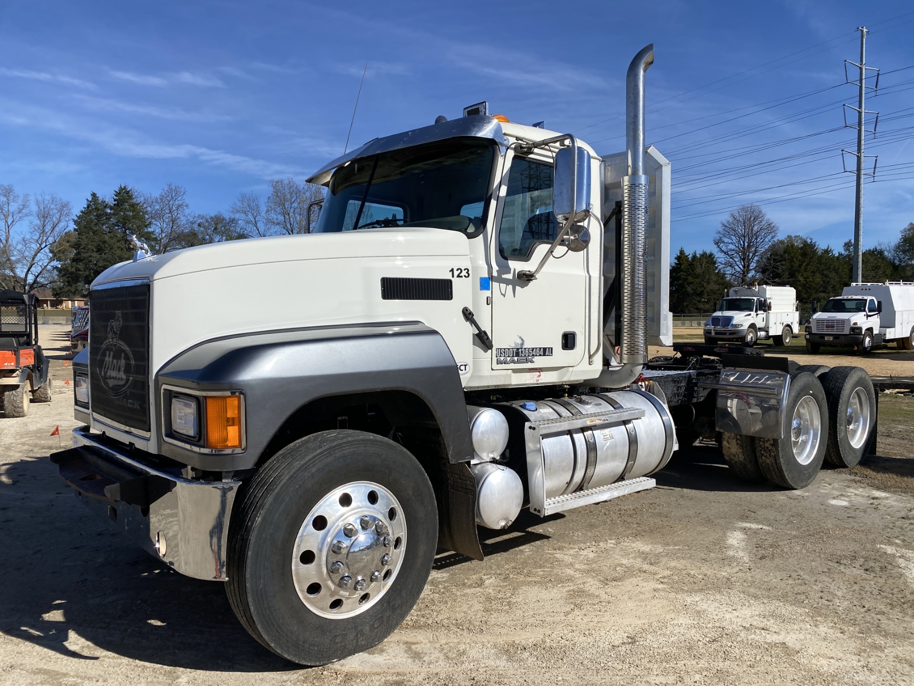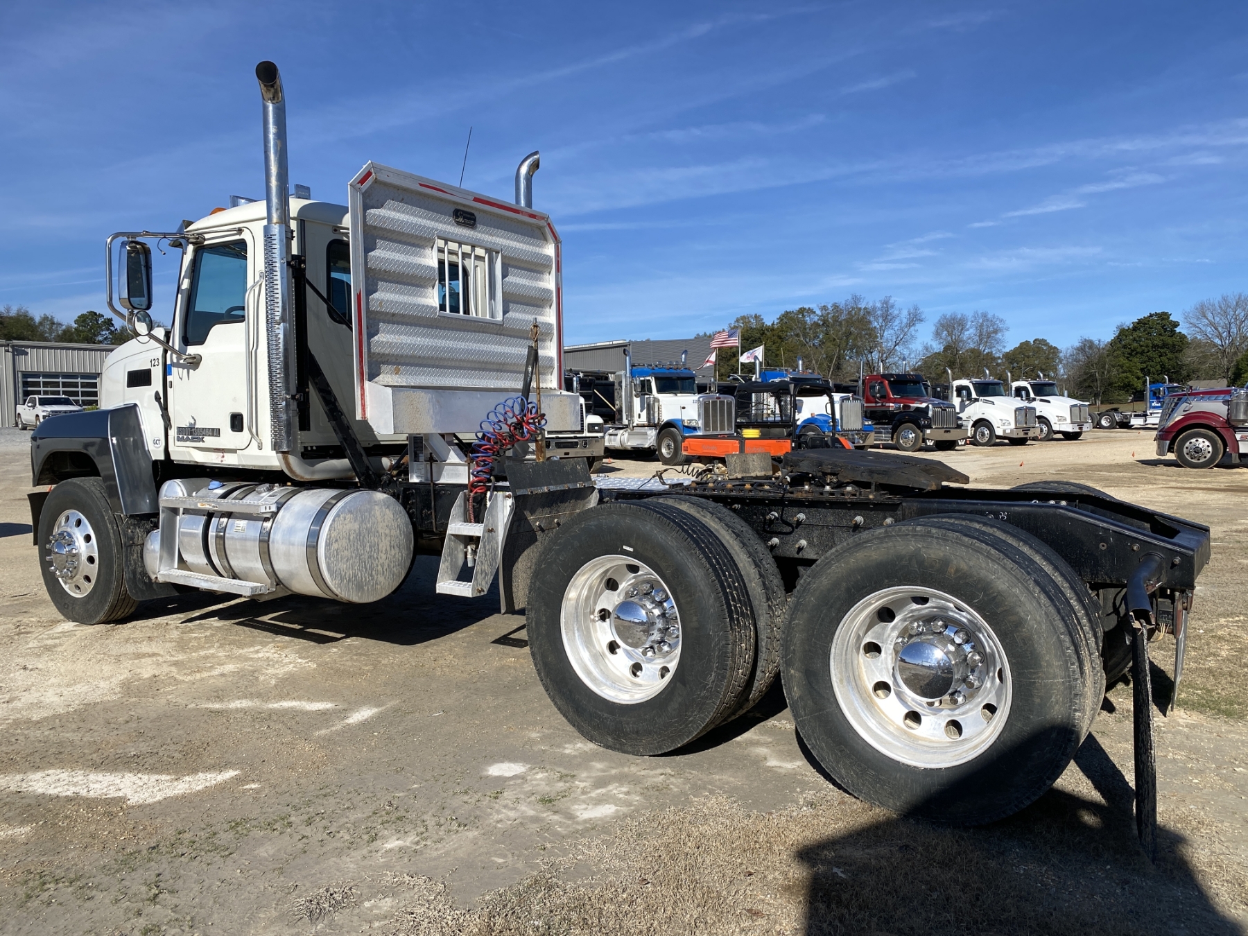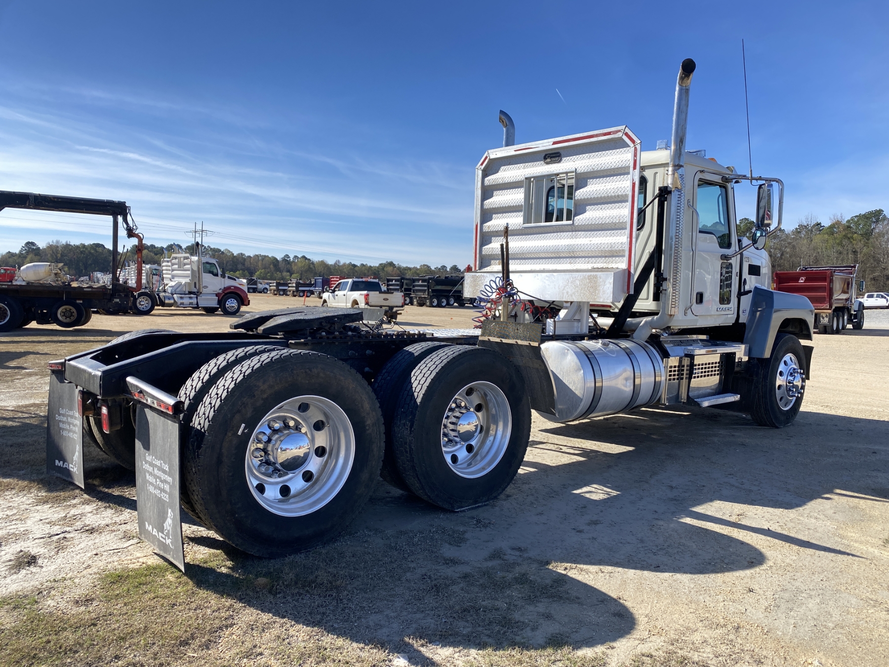 T/A, 505 HP Mack MP8 engine, 10 speed trans, 44K rears, 12K front, 220" W/B, alum headache rack, 11R24.5 tires, all alum