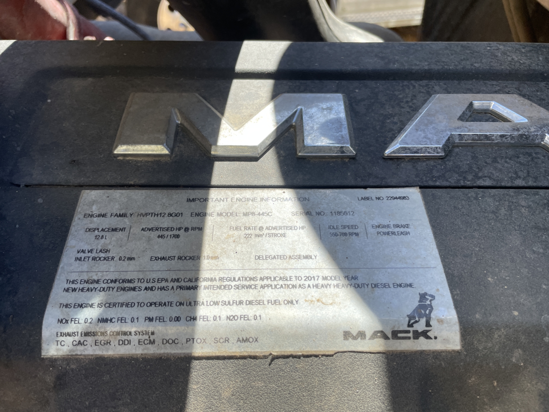 T/A, 445 HP Mack MP8 engine, Mack mDrive A/T, 40K rears, air ride, 12,350 lb. front, 181" W/B, 22.5 tires