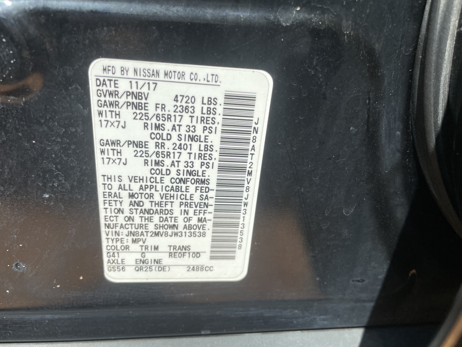 Vehicle ID Number: JN8AT2MV8JW313538