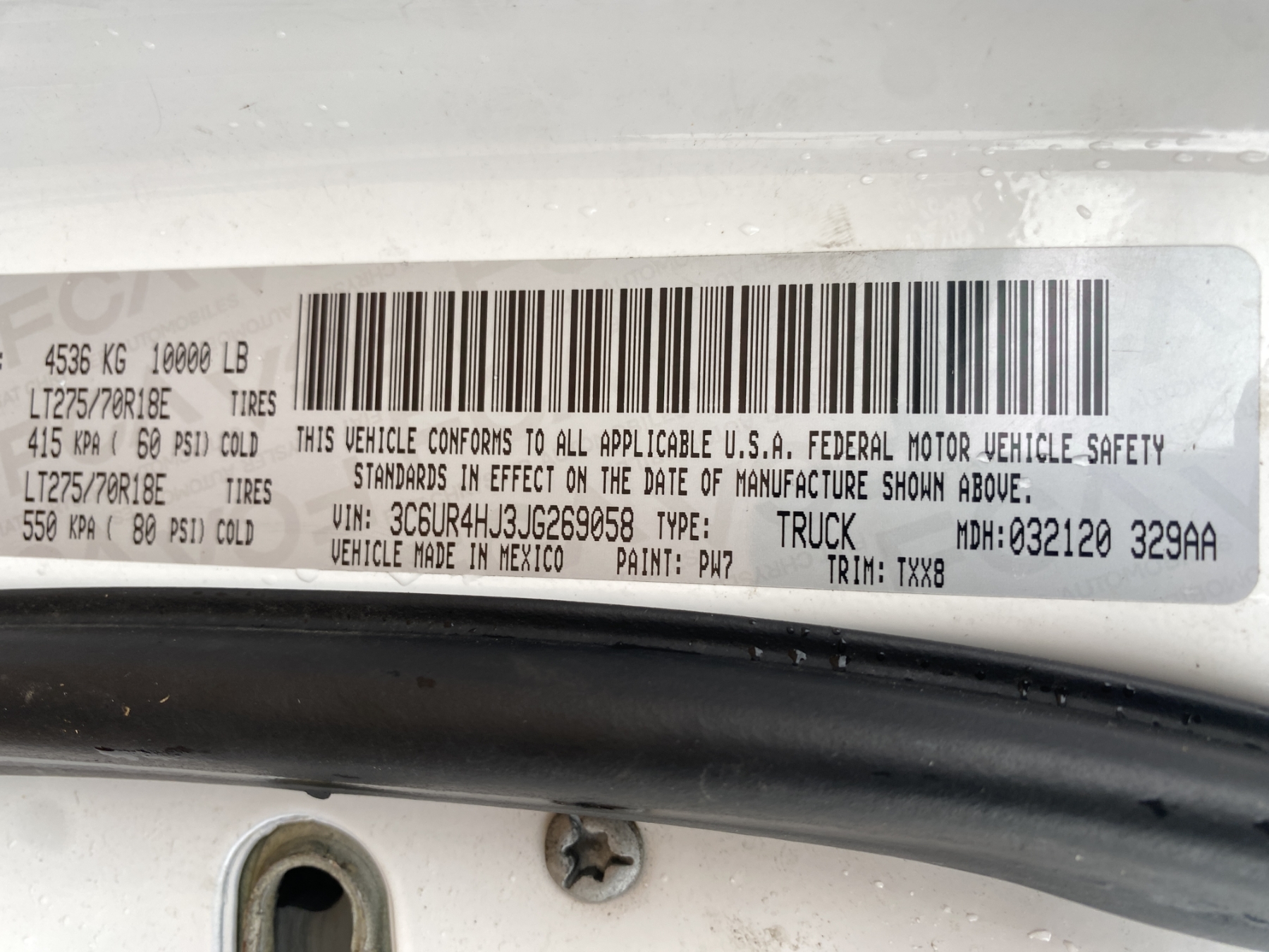Vehicle ID Number: 3C6UR4HJ3JG269058