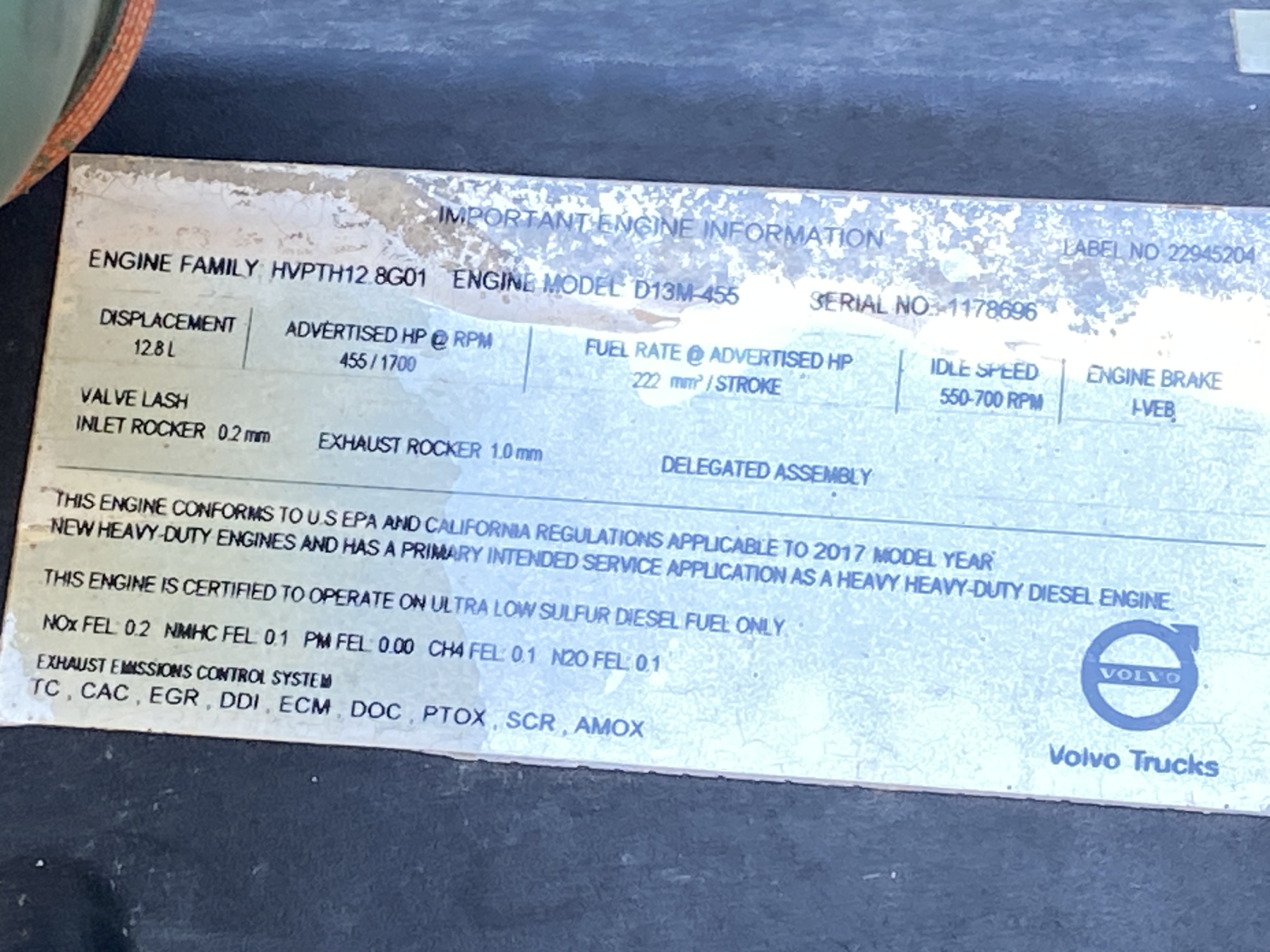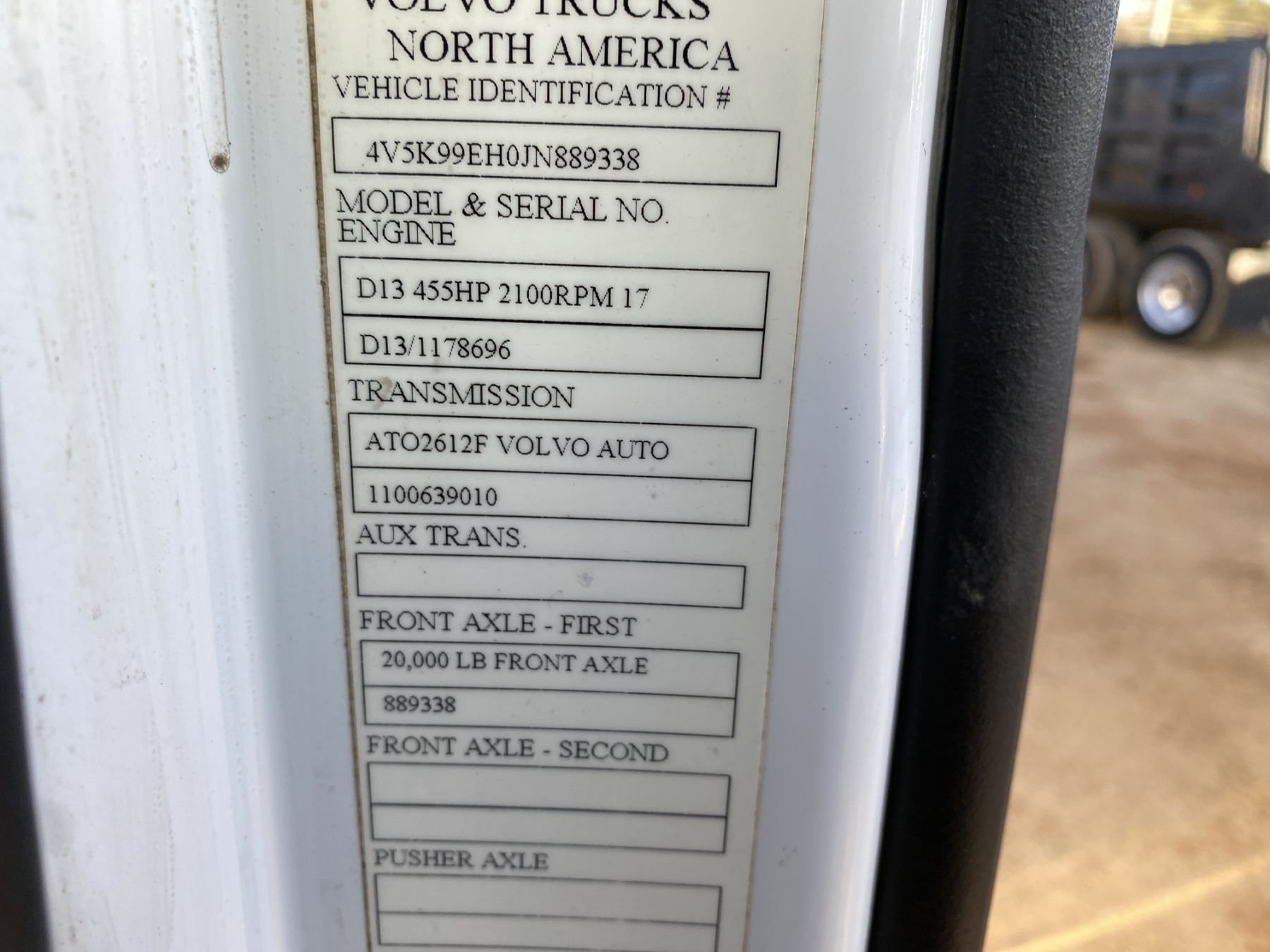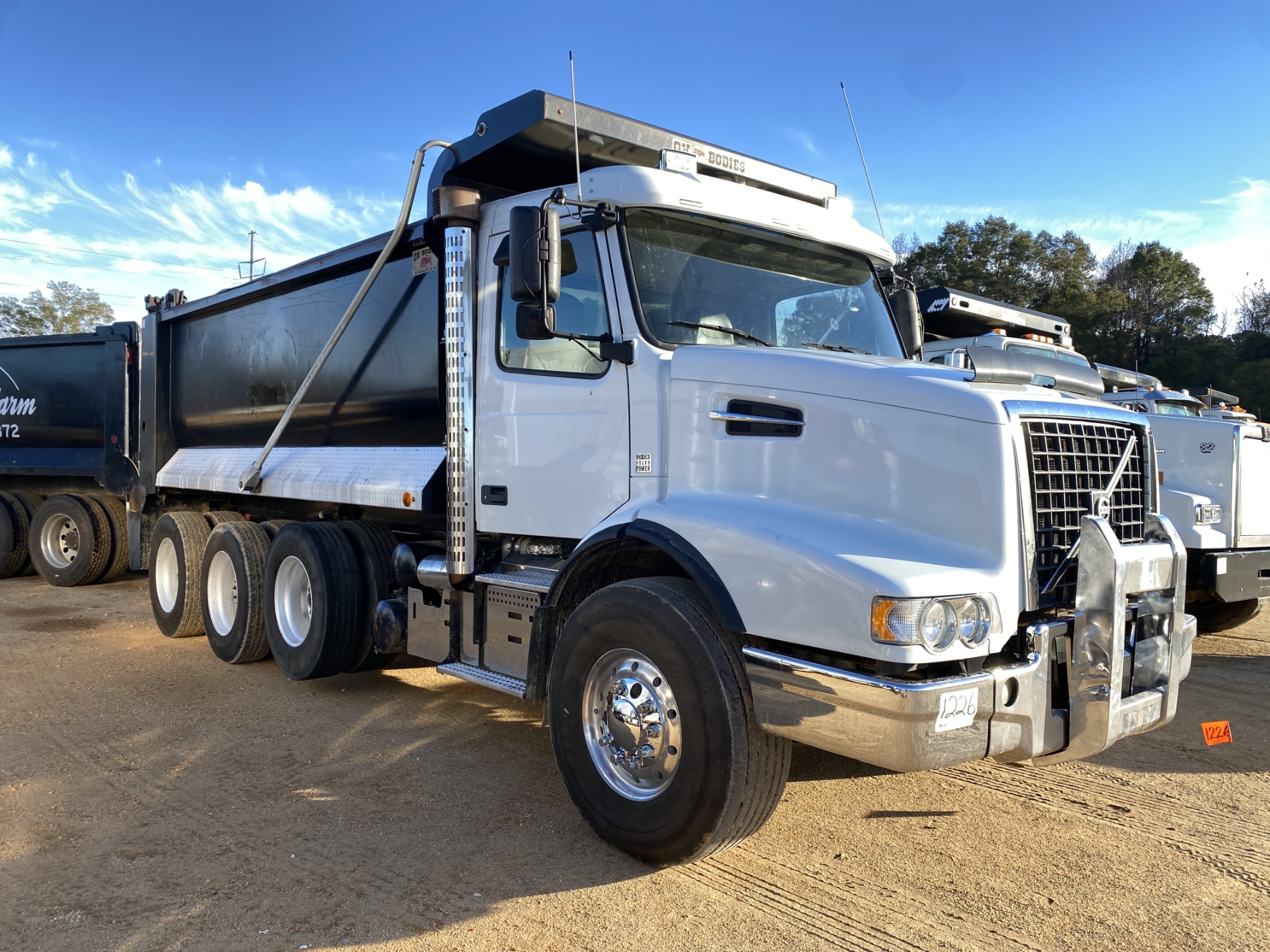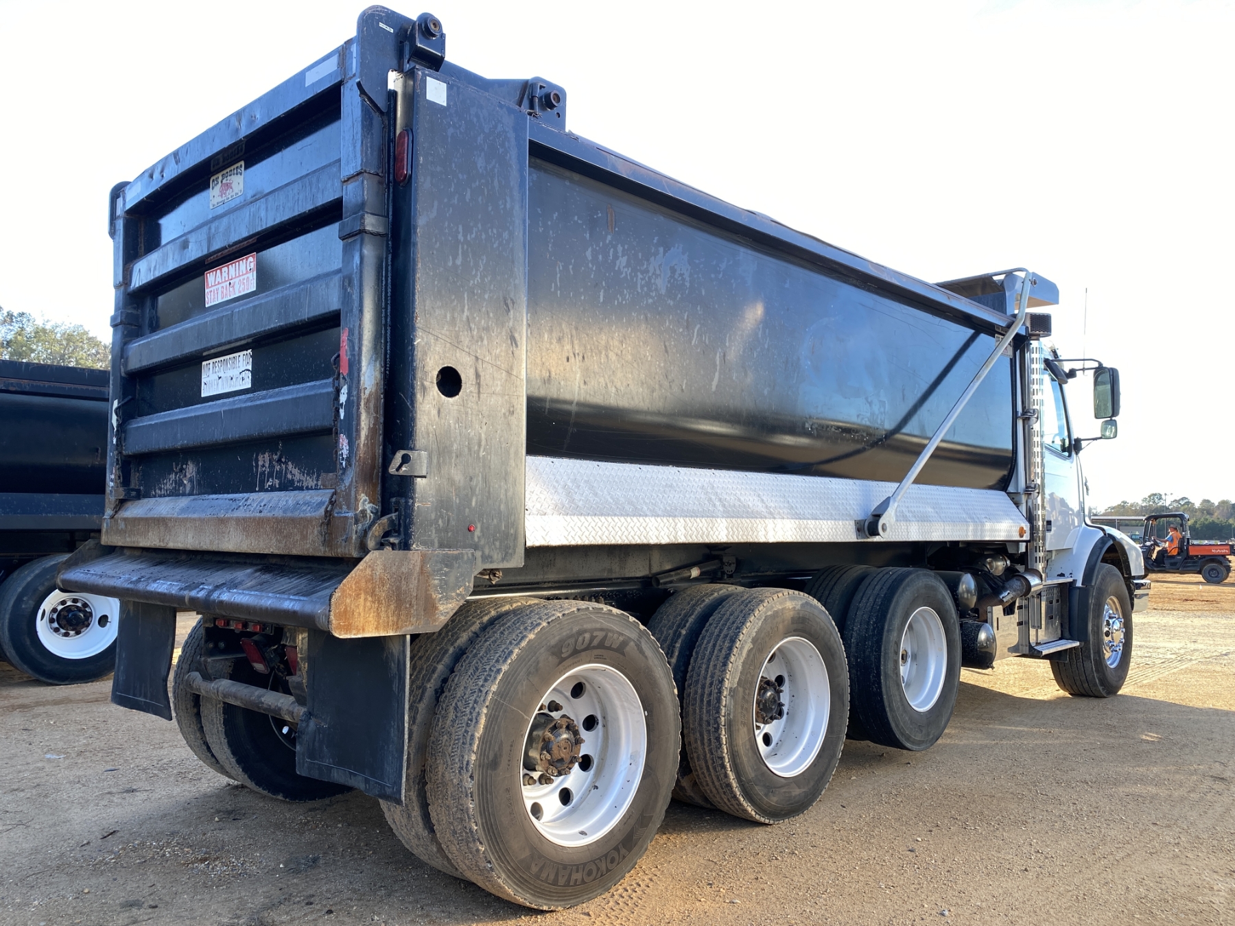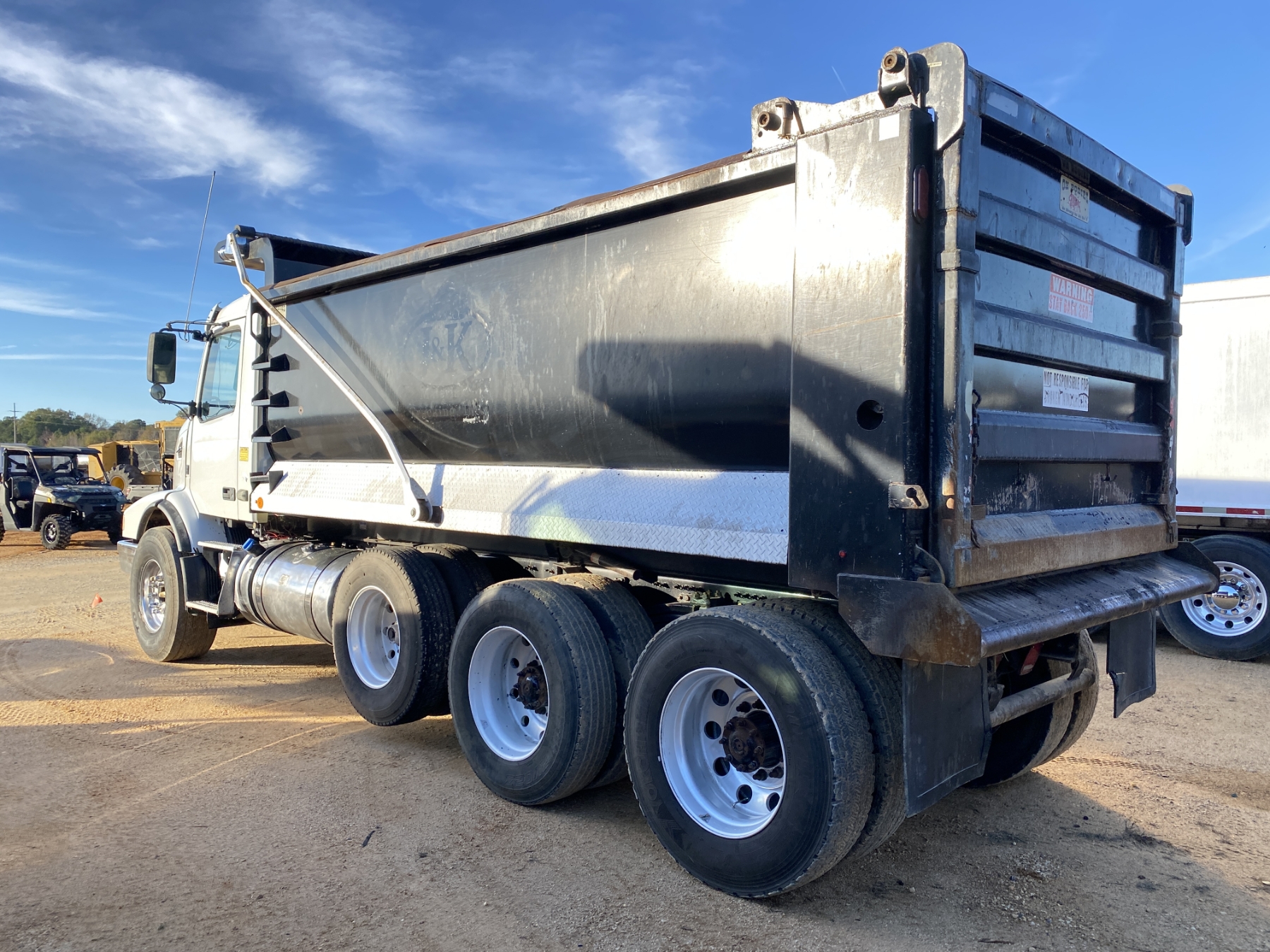 Tri Axle, 455 HP Volvo D13 engine, A/T, 46K rears, 18,800 lb. front, 16' Hard Ox body, 11R24.5 rear tires, 425/65R22.5 front tires, all alum