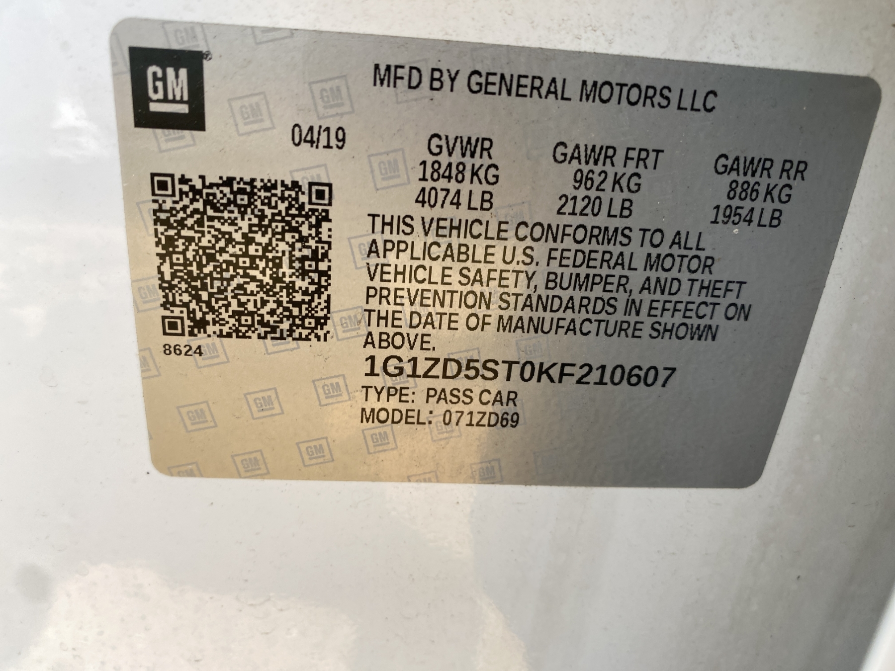 Vehicle ID Number: 1G1ZD5ST0KF210607