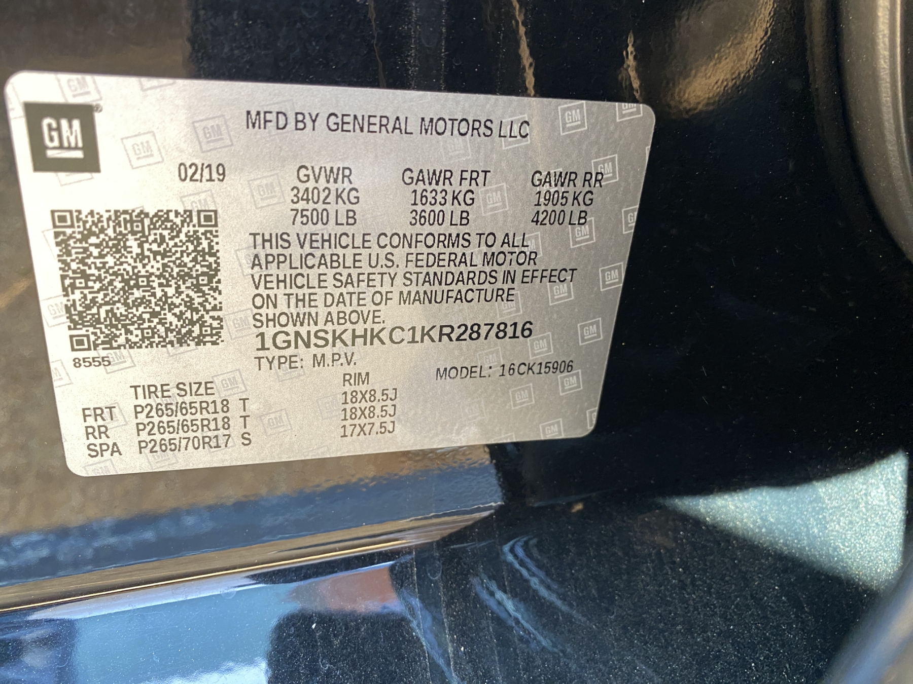 Vehicle ID Number: 1GNSKHKC1KR287816