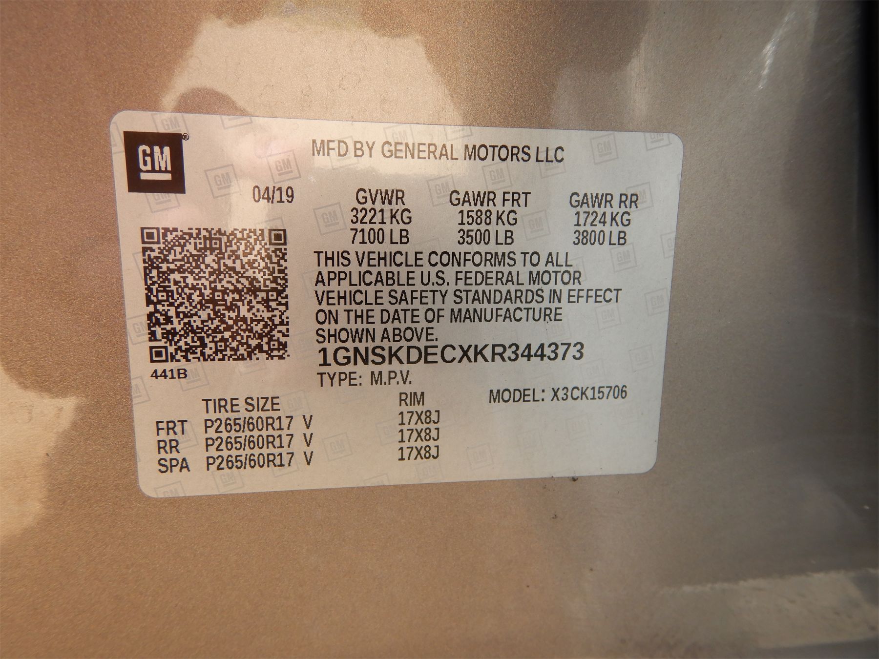 Vehicle ID Number: 1GNSKDECXKR344373