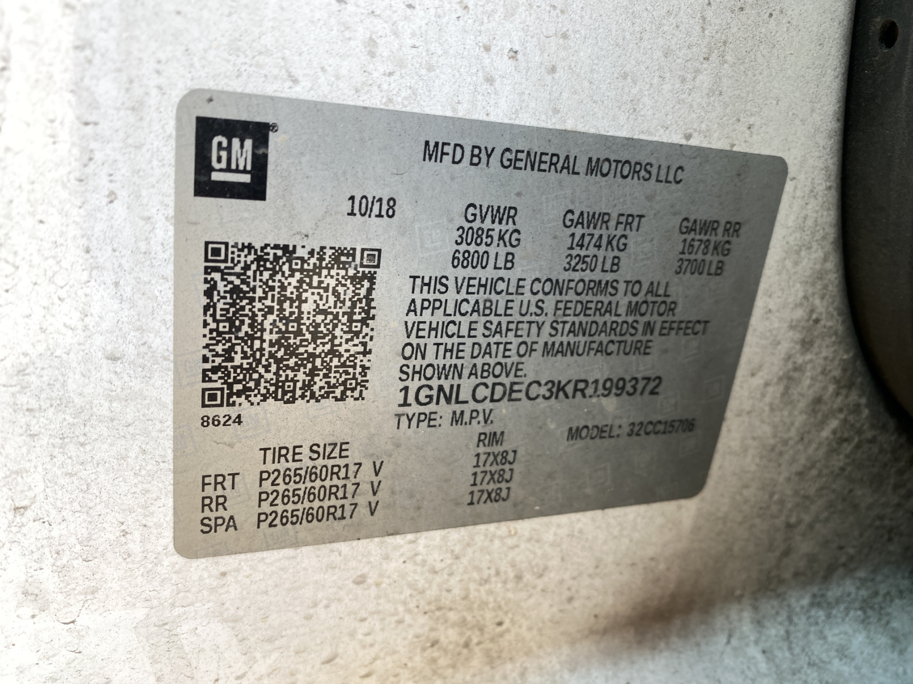 Vehicle ID Number: 1GNLCDEC3KR199372