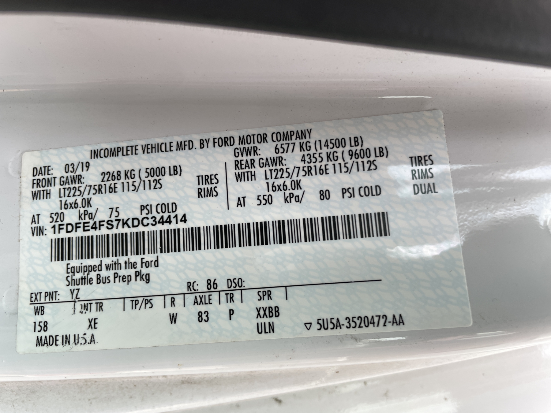 Vehicle ID Number: 1FDFE4FS7KDC34414