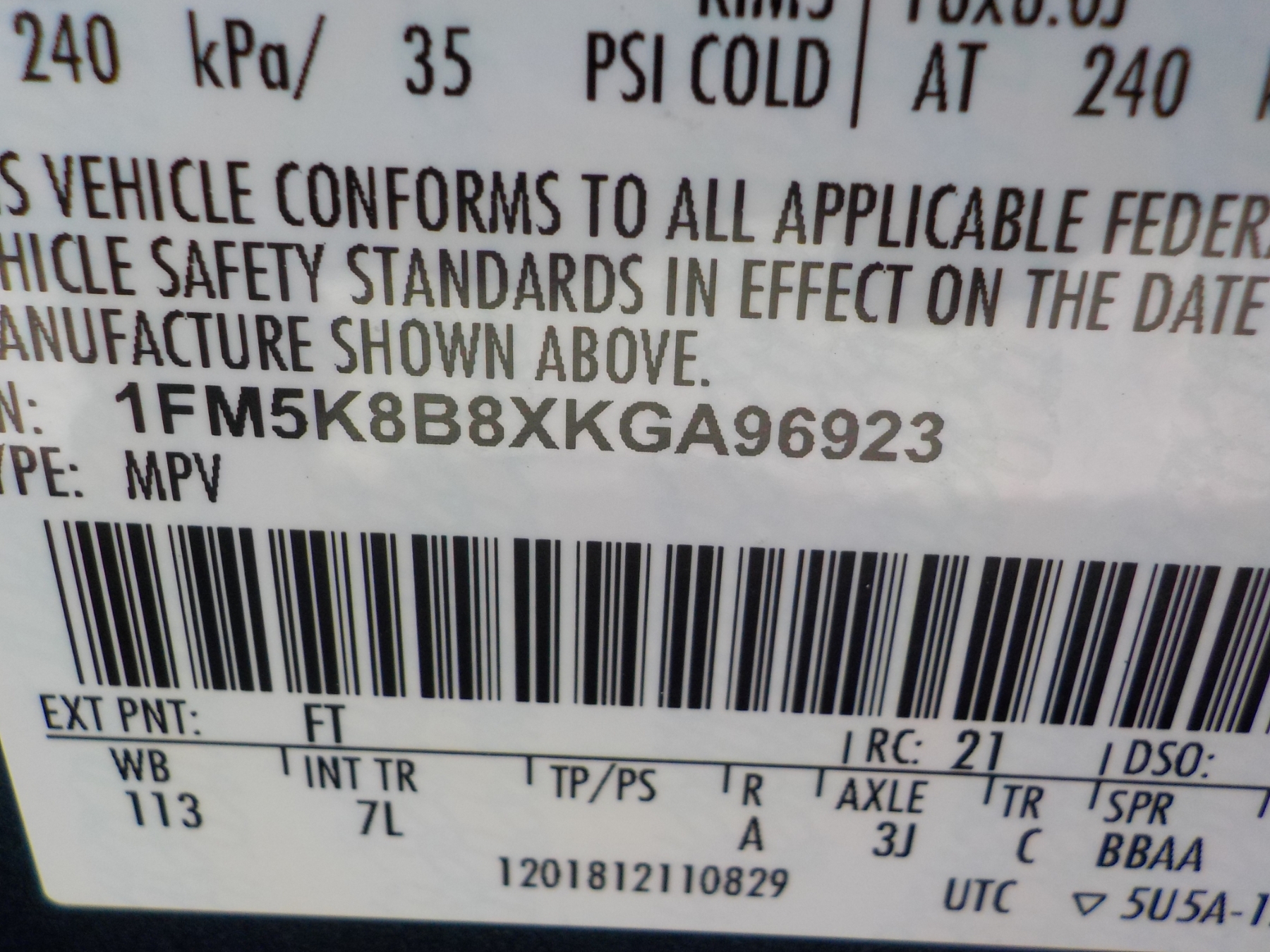 Vehicle ID Number: 1FM5K8B8XKGA96923