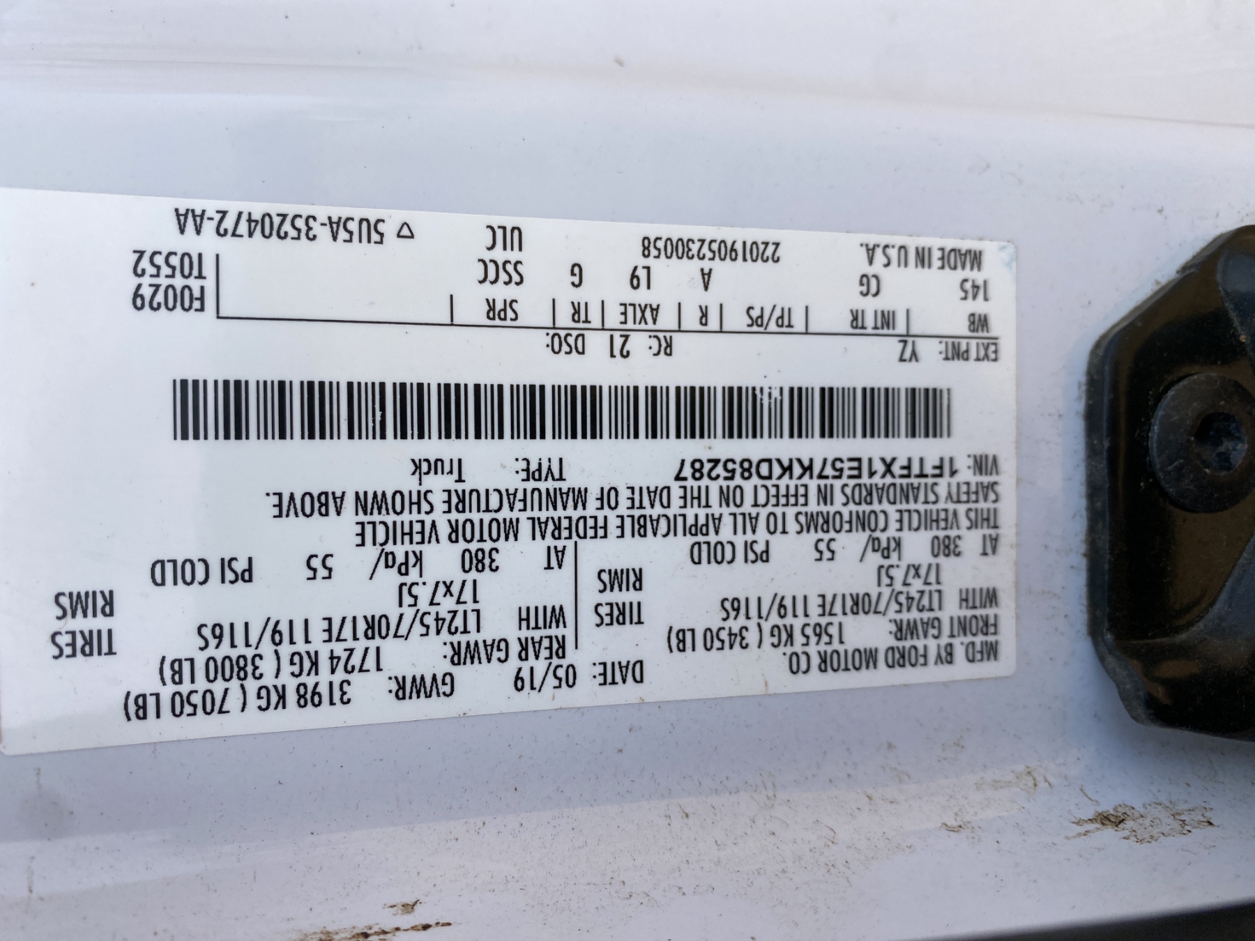 Vehicle ID Number: 1FTFX1E57KKD85287