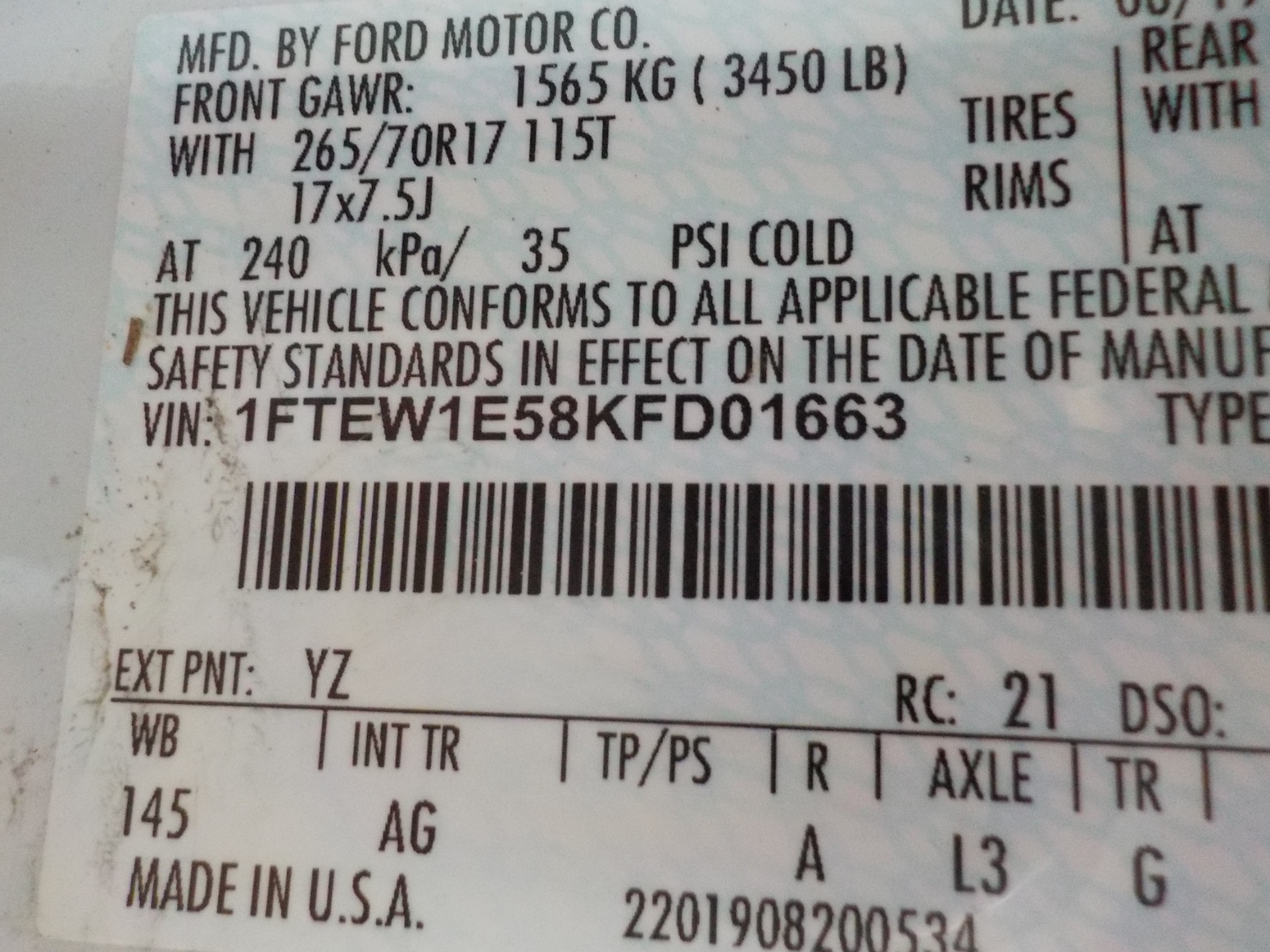Vehicle ID Number: 1FTEW1E58KFD01663