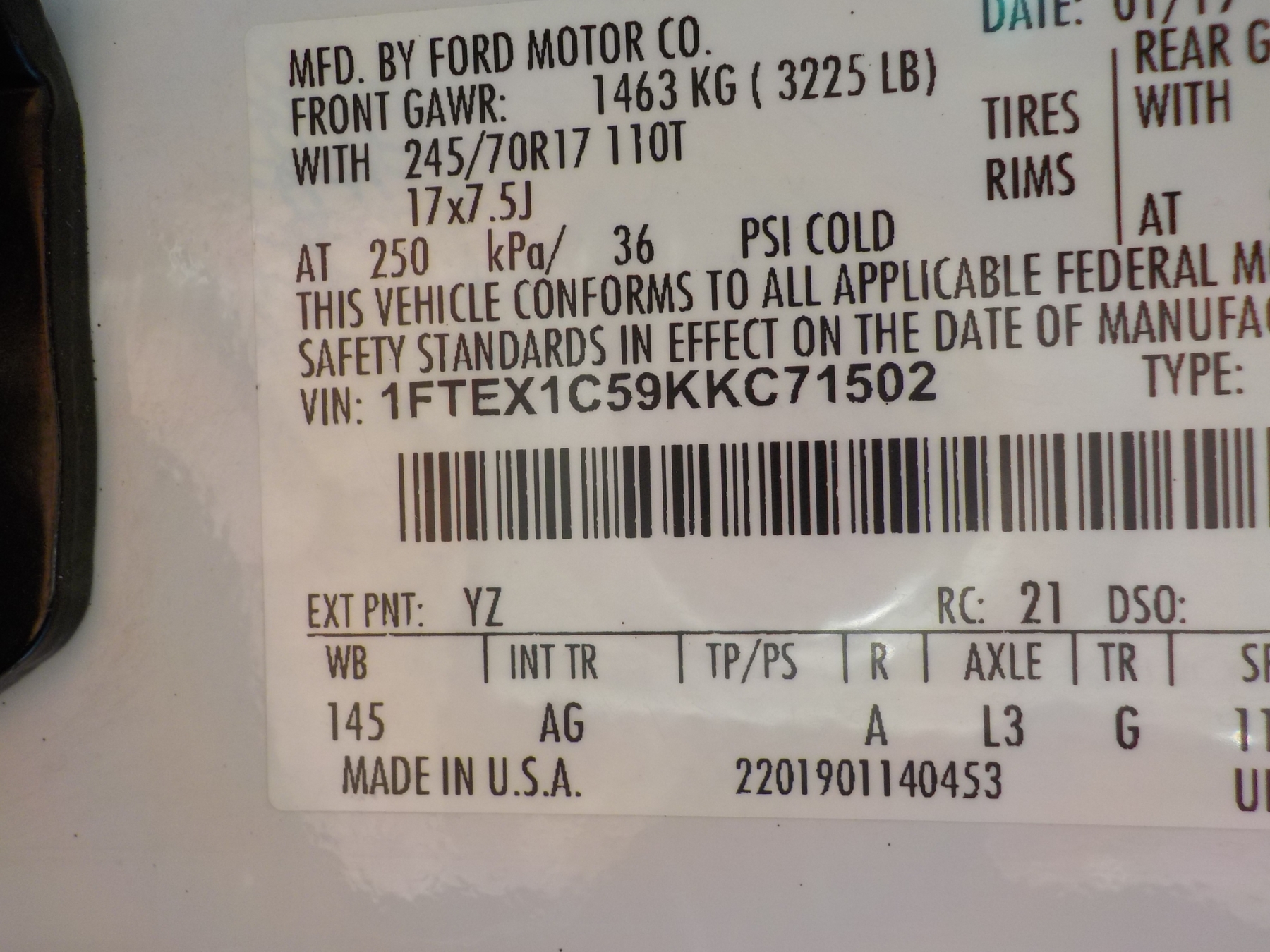 Vehicle ID Number: 1FTEX1C59KKC71502