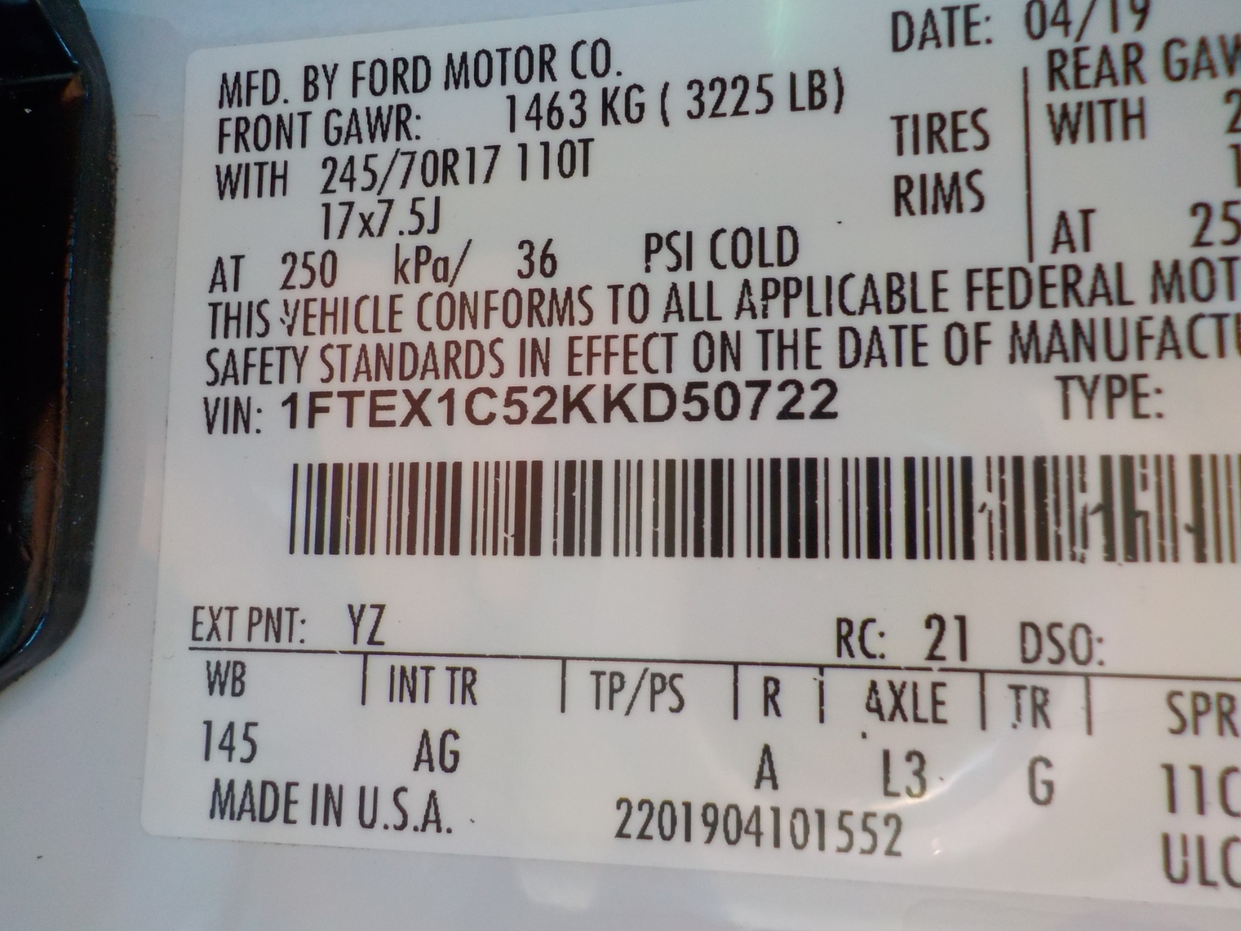 Vehicle ID Number: 1FTEX1C52KKD50722