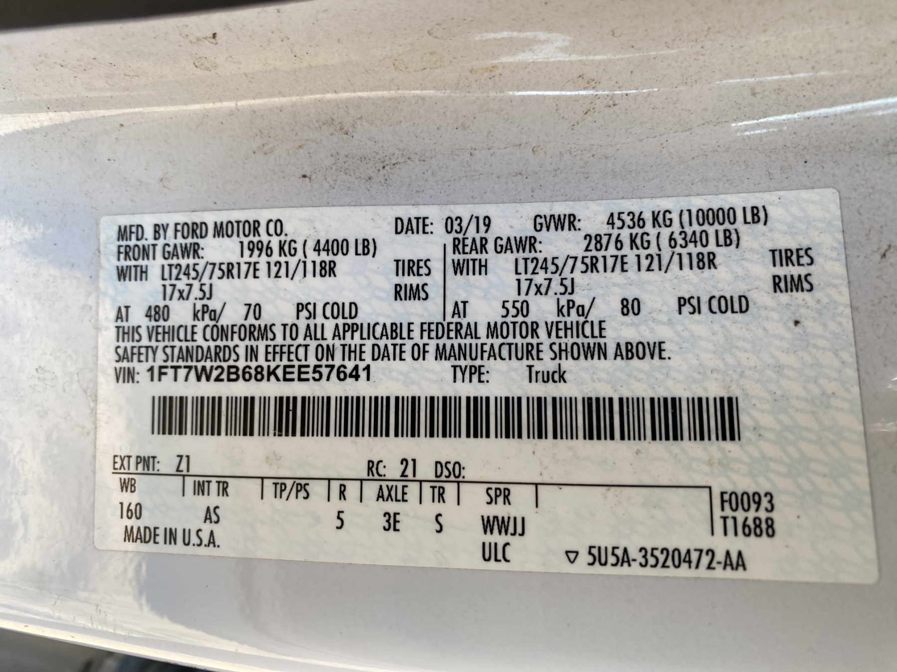Vehicle ID Number: 1FT7W2B68KEE57641