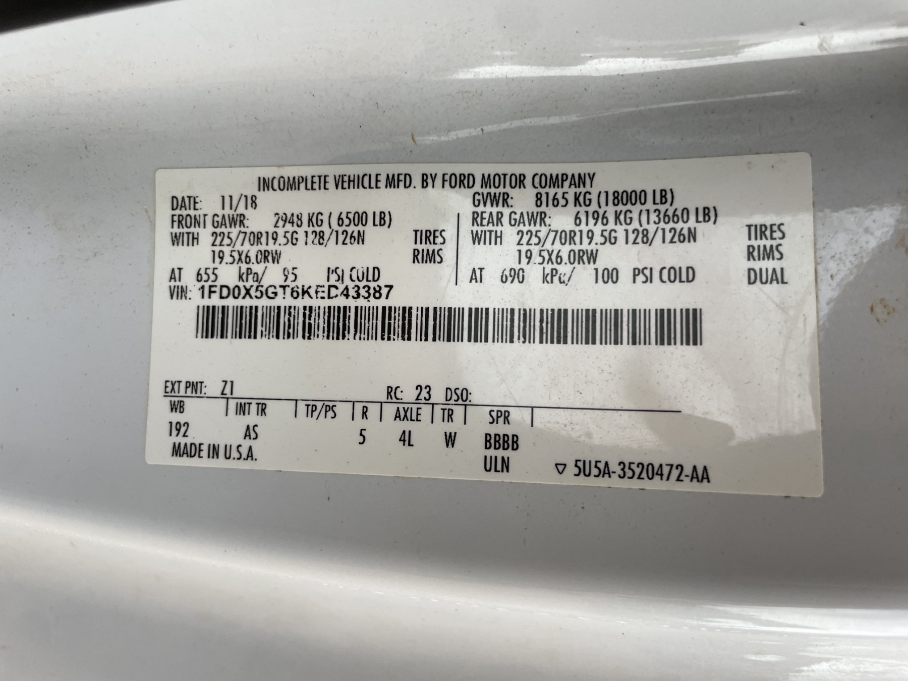 Vehicle ID Number: 1FD0X5GT6KED43387