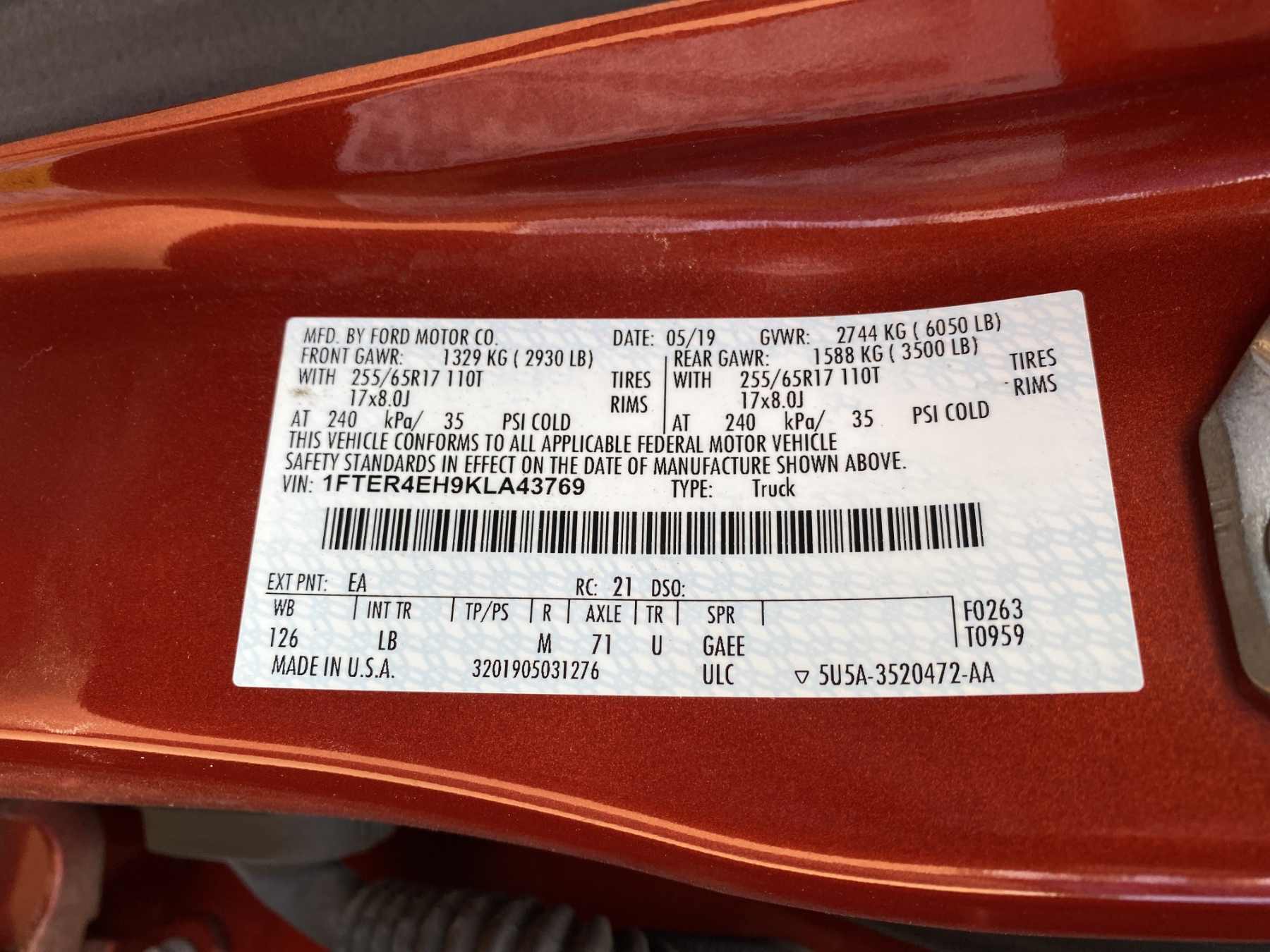 Vehicle ID Number: 1FTER4EH9KLA43769