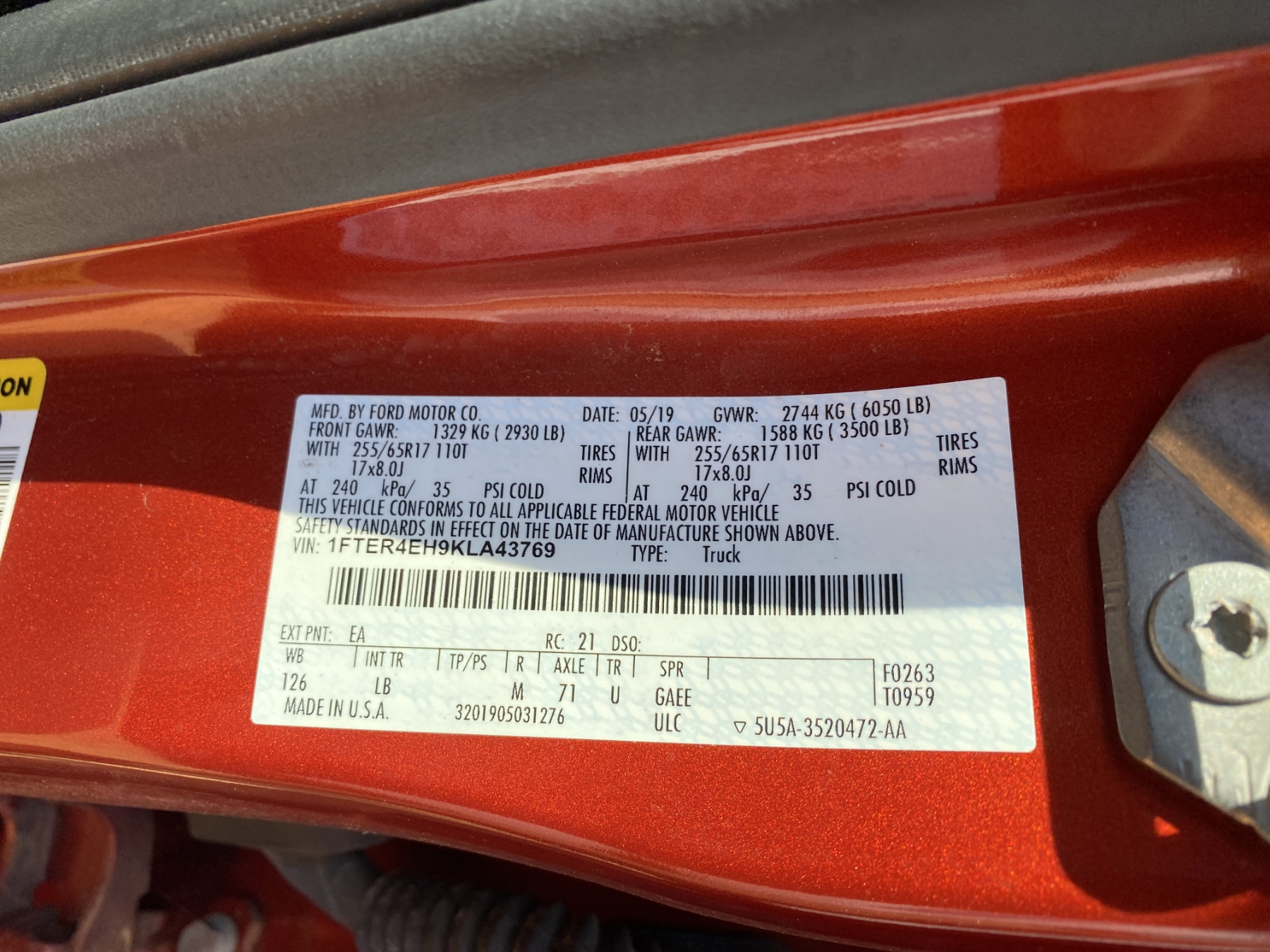 Vehicle ID Number: 1FTER4EH9KLA43769