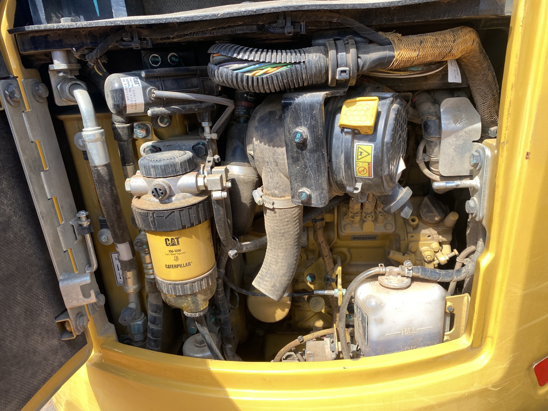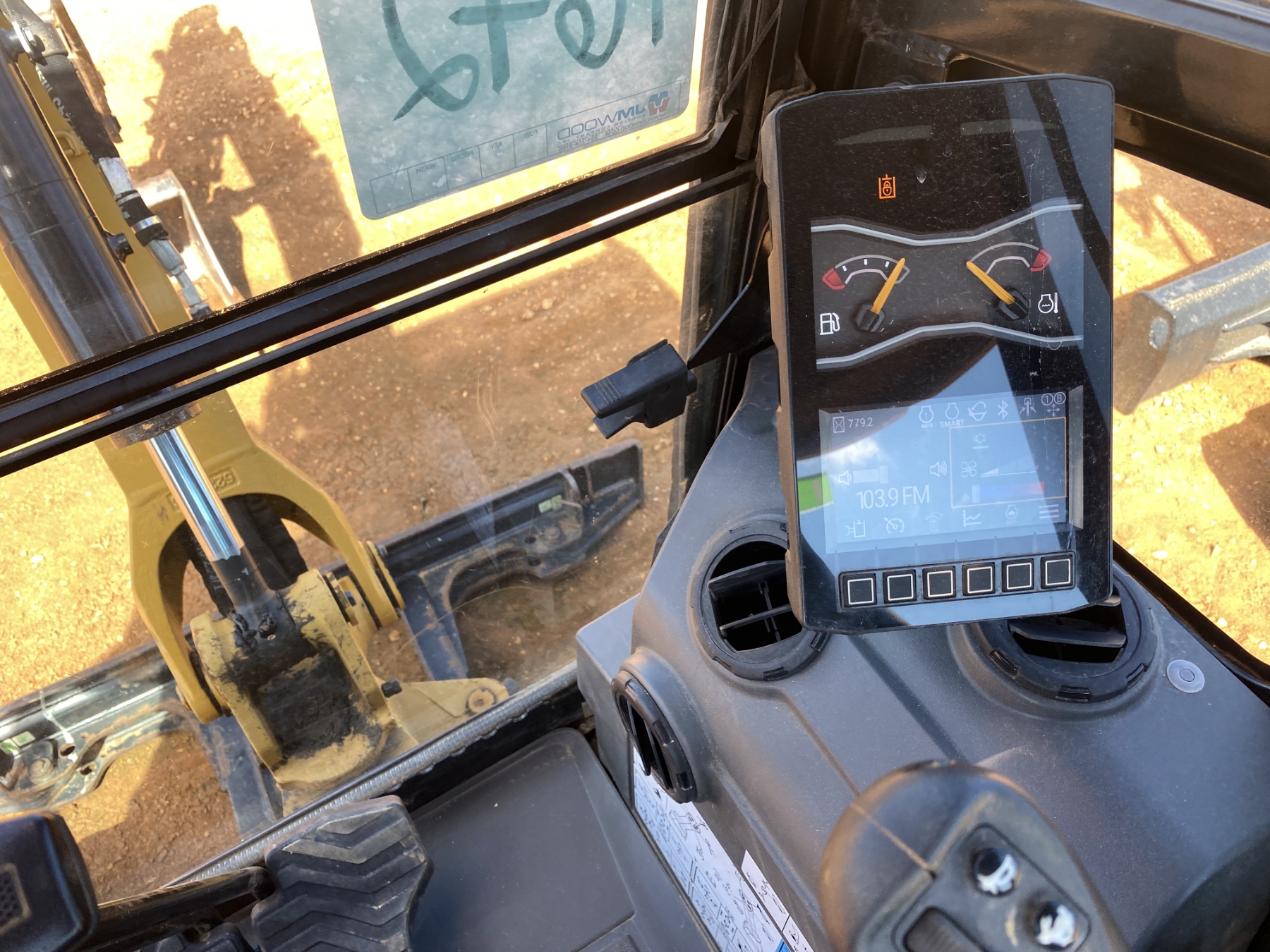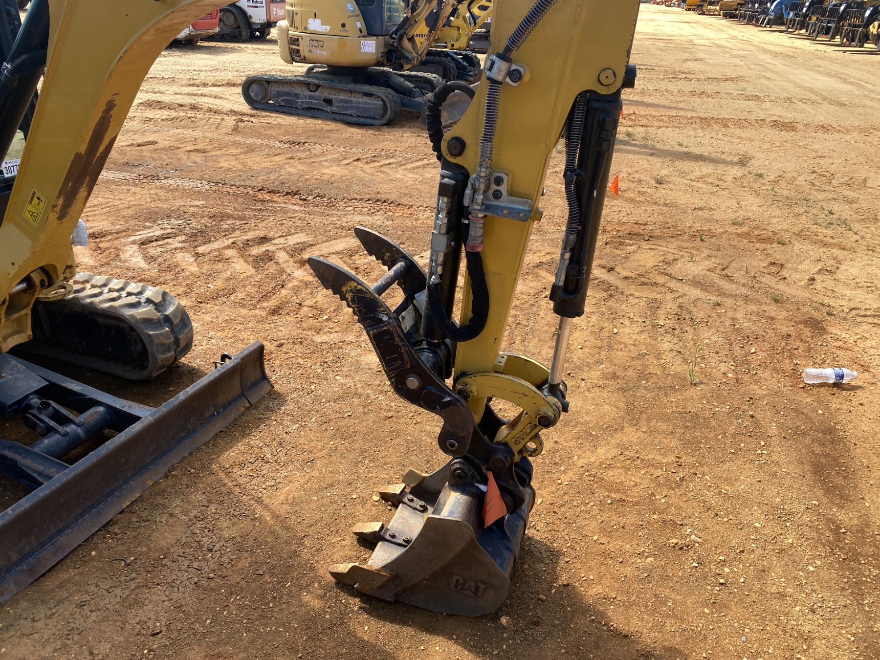 3' 4" stick, 16" bucket, coupler, hyd thumb, aux hyd, blade, cab, A/C