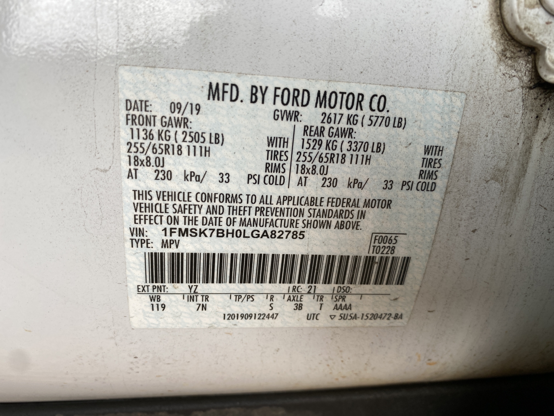 Vehicle ID Number: 1FMSK7BH0LGA82785