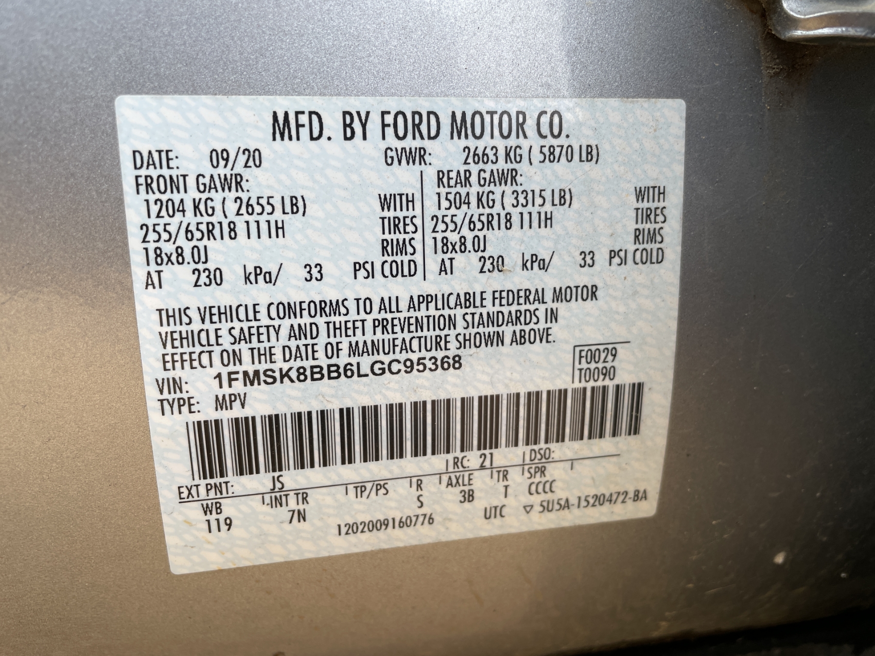 Vehicle ID Number: 1FMSK8BB6LGC95368